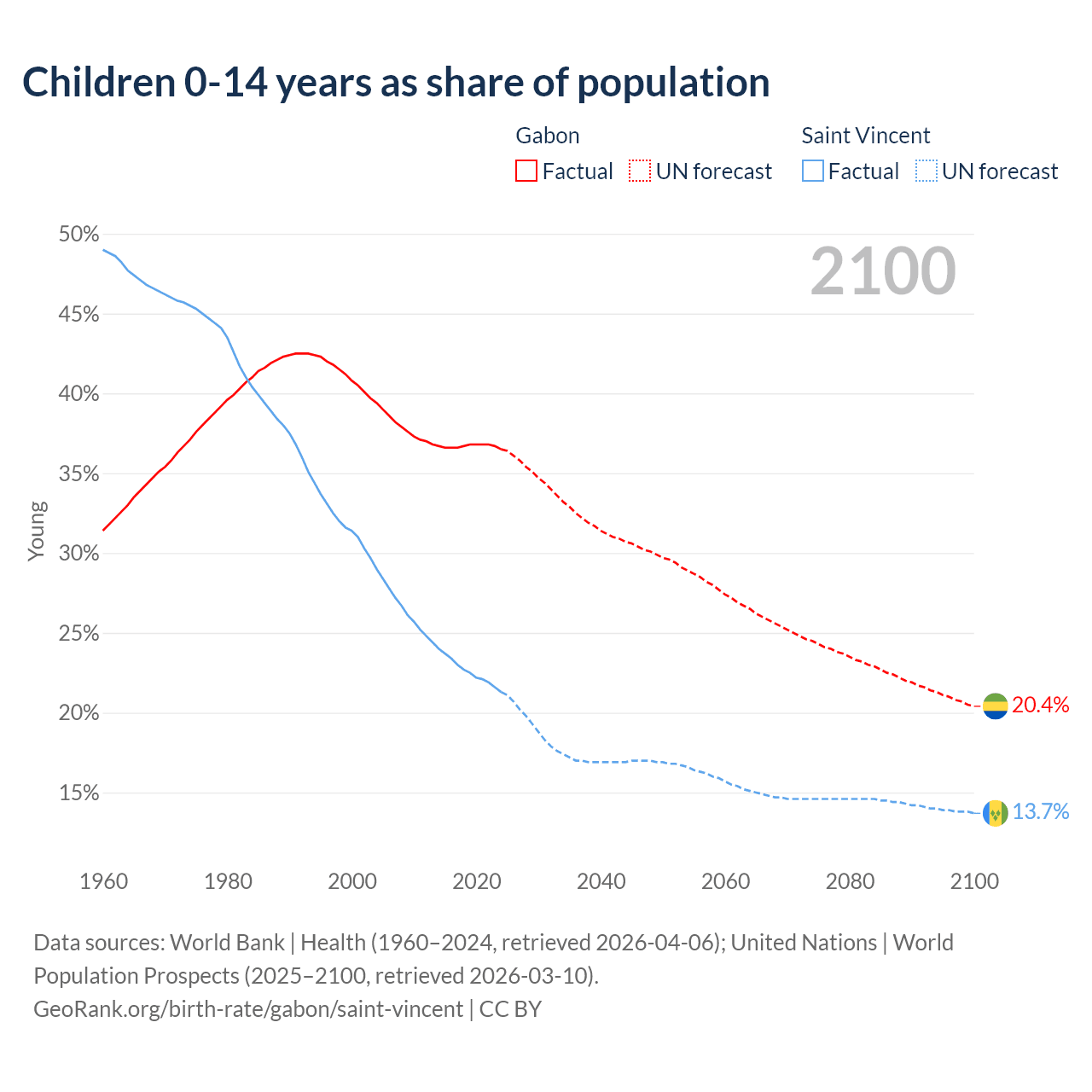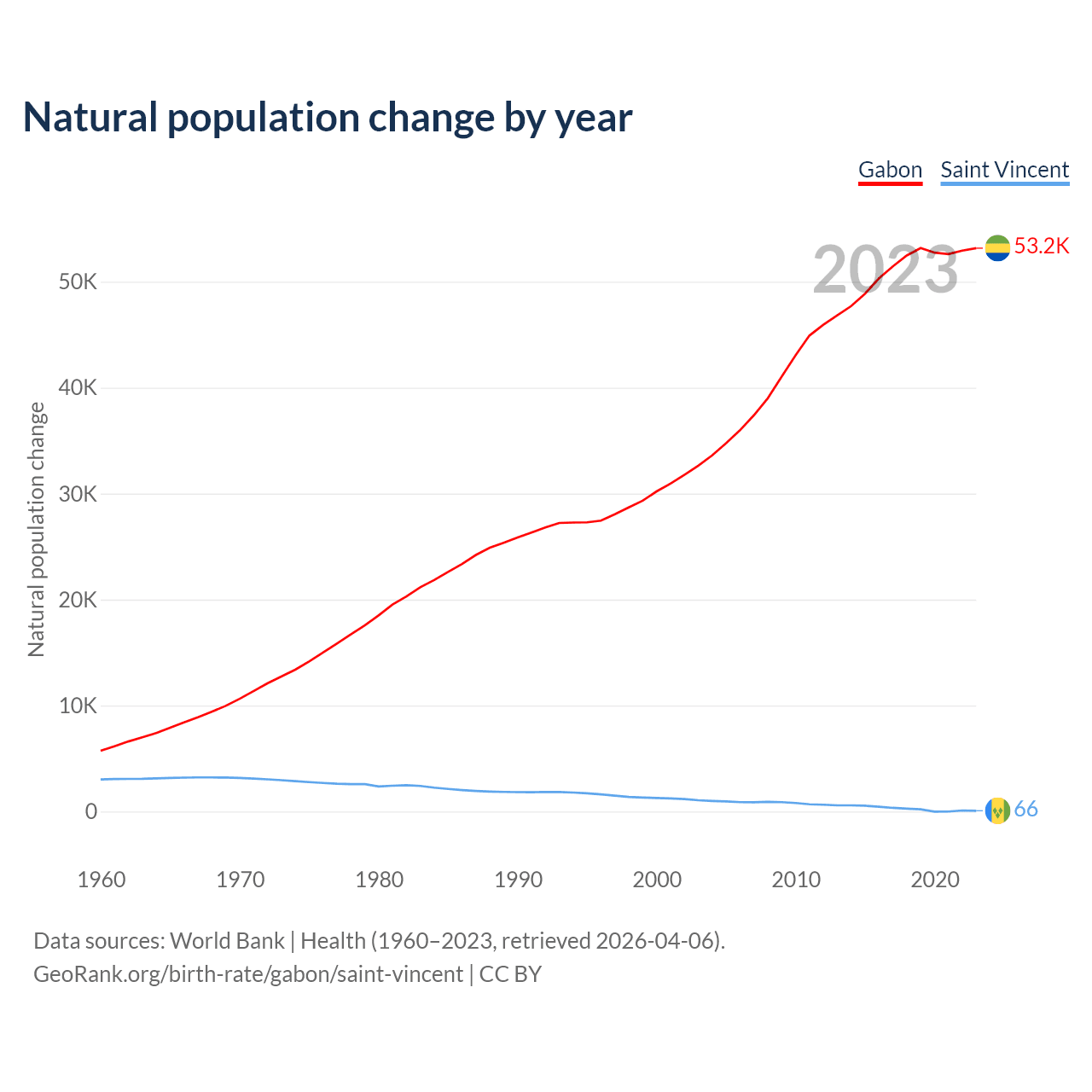 Gabon has an annual birth rate of 27.7 births per 1,000 people, compared to 12.2 for Saint Vincent. The average number of children a woman is expected to have during her lifetime — the fertility rate, is 3.65 in Gabon and 1.78 in Saint Vincent — 51.3% difference.