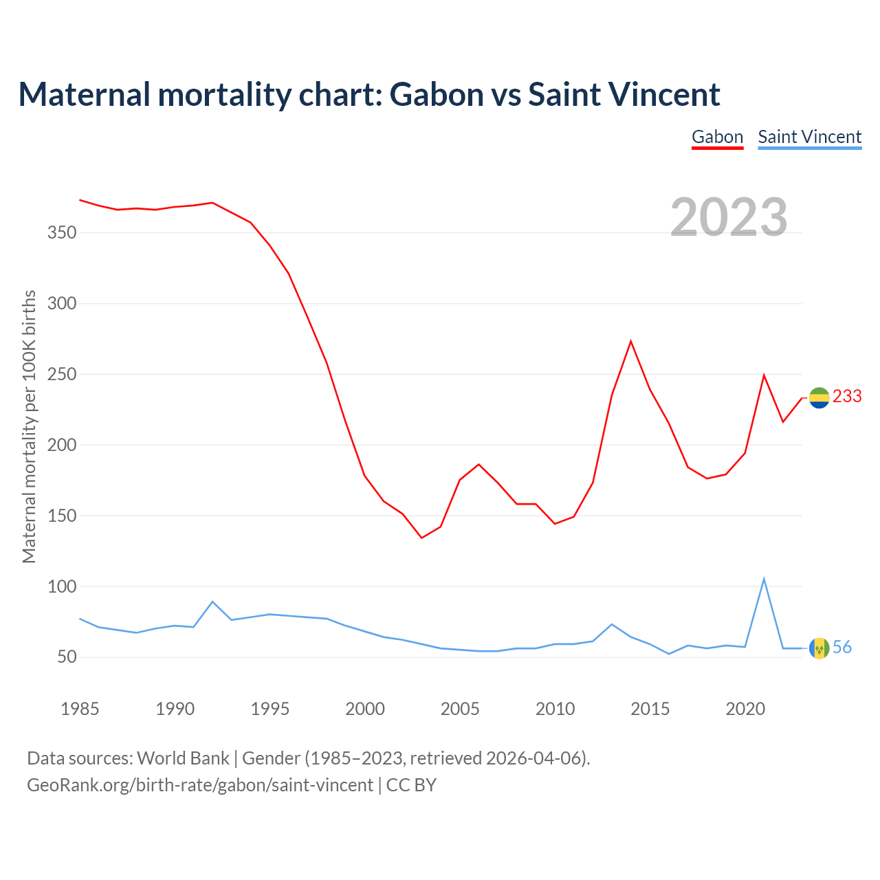 The maternal mortality rate, which is the probability of dying during childbirth or within 42 days of pregnancy termination, is 233 deaths per 100,000 live births in Gabon, compared to 56 deaths in Saint Vincent.