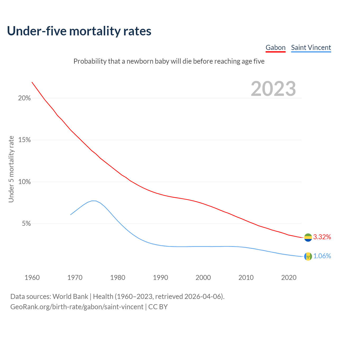 The chance that a newborn baby will die before reaching age five is 3.32% in Gabon and 1.06% in Saint Vincent. Above is a chart with historical data on under-five mortality rates.