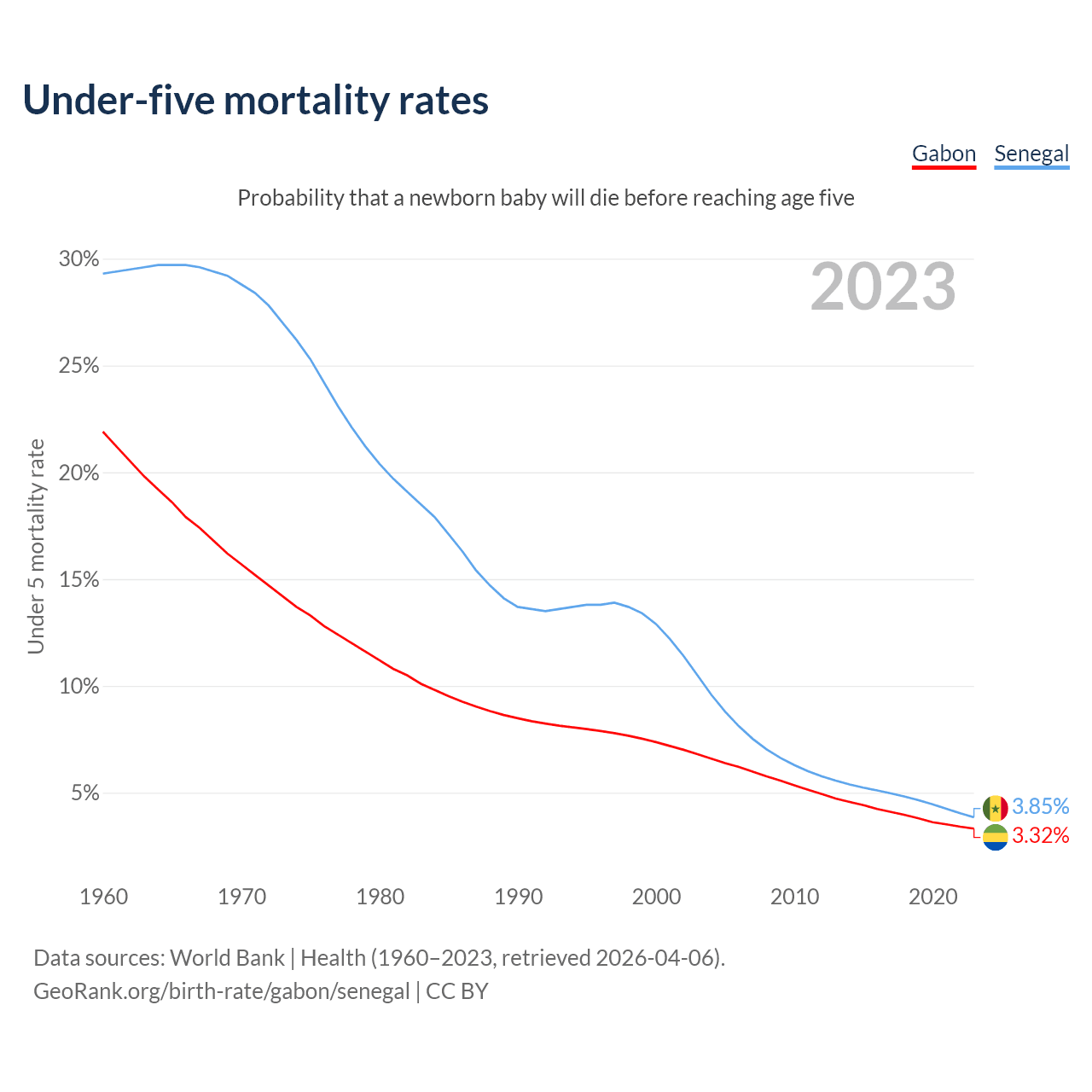 The chance that a newborn baby will die before reaching age five is 3.32% in Gabon and 3.85% in Senegal. Above is a chart with historical data on under-five mortality rates.