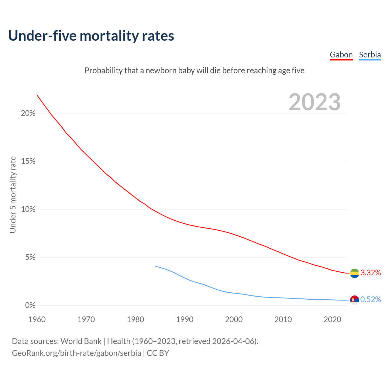 The chance that a newborn baby will die before reaching age five is 3.32% in Gabon and 0.52% in Serbia. Above is a chart with historical data on under-five mortality rates.