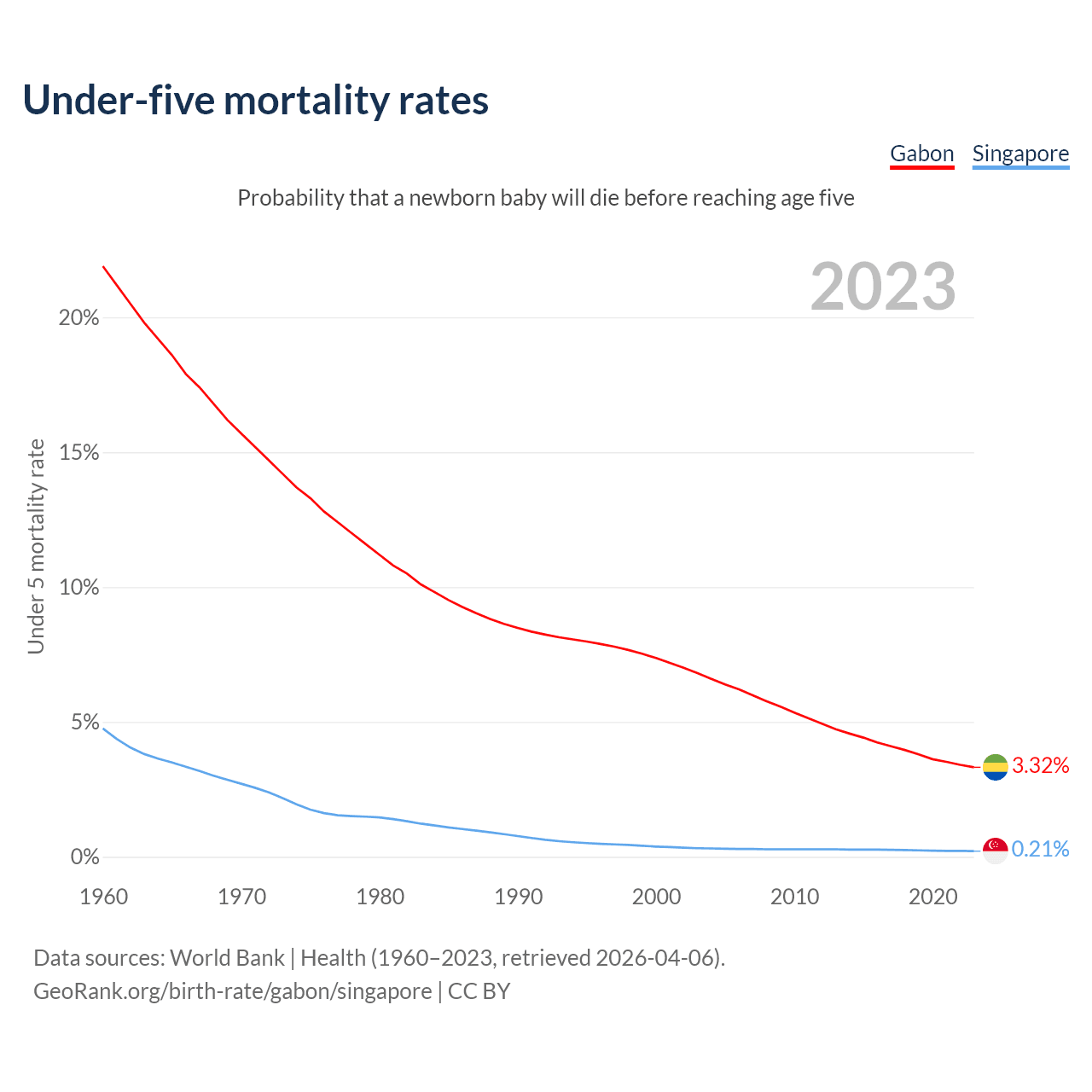 The chance that a newborn baby will die before reaching age five is 3.32% in Gabon and 0.21% in Singapore. Above is a chart with historical data on under-five mortality rates.