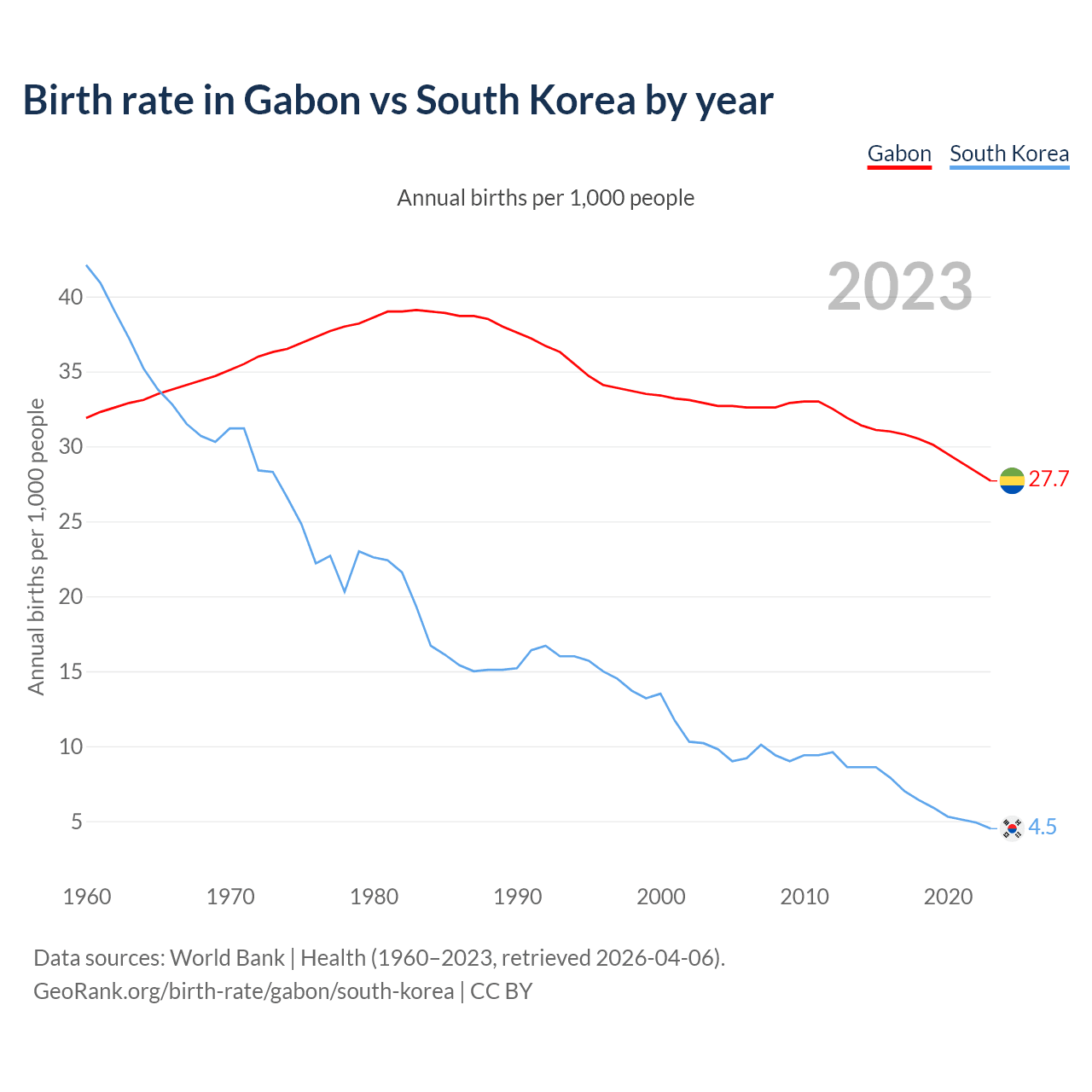 Gabon has an annual birth rate of 27.7 births per 1,000 people, compared to 4.5 for South Korea. The average number of children a woman is expected to have during her lifetime — the fertility rate, is 3.65 in Gabon and 0.72 in South Korea — 80.2% difference.
