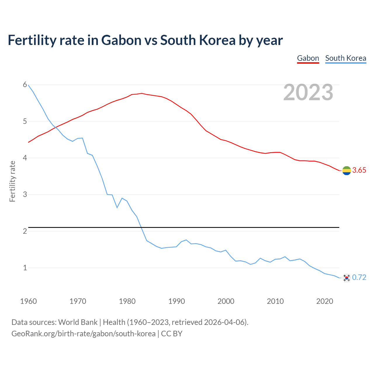 According to the latest available data on birth rates, the fertility rate in Gabon was 3.65 children per woman in 2023, compared to 0.72 in South Korea in 2023. The replacement level is considered to be 2.1 children per woman.