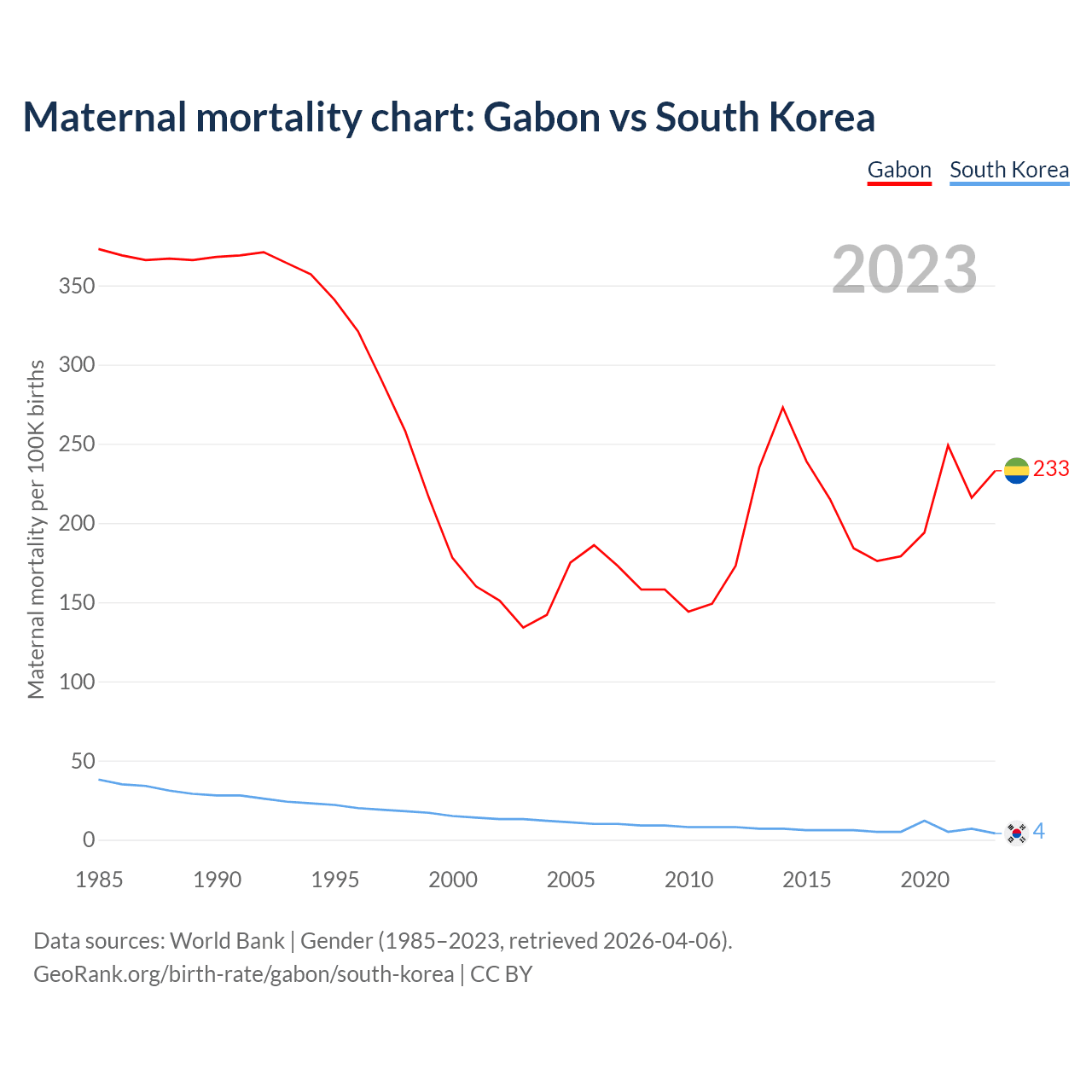 The maternal mortality rate, which is the probability of dying during childbirth or within 42 days of pregnancy termination, is 233 deaths per 100,000 live births in Gabon, compared to 4 deaths in South Korea.