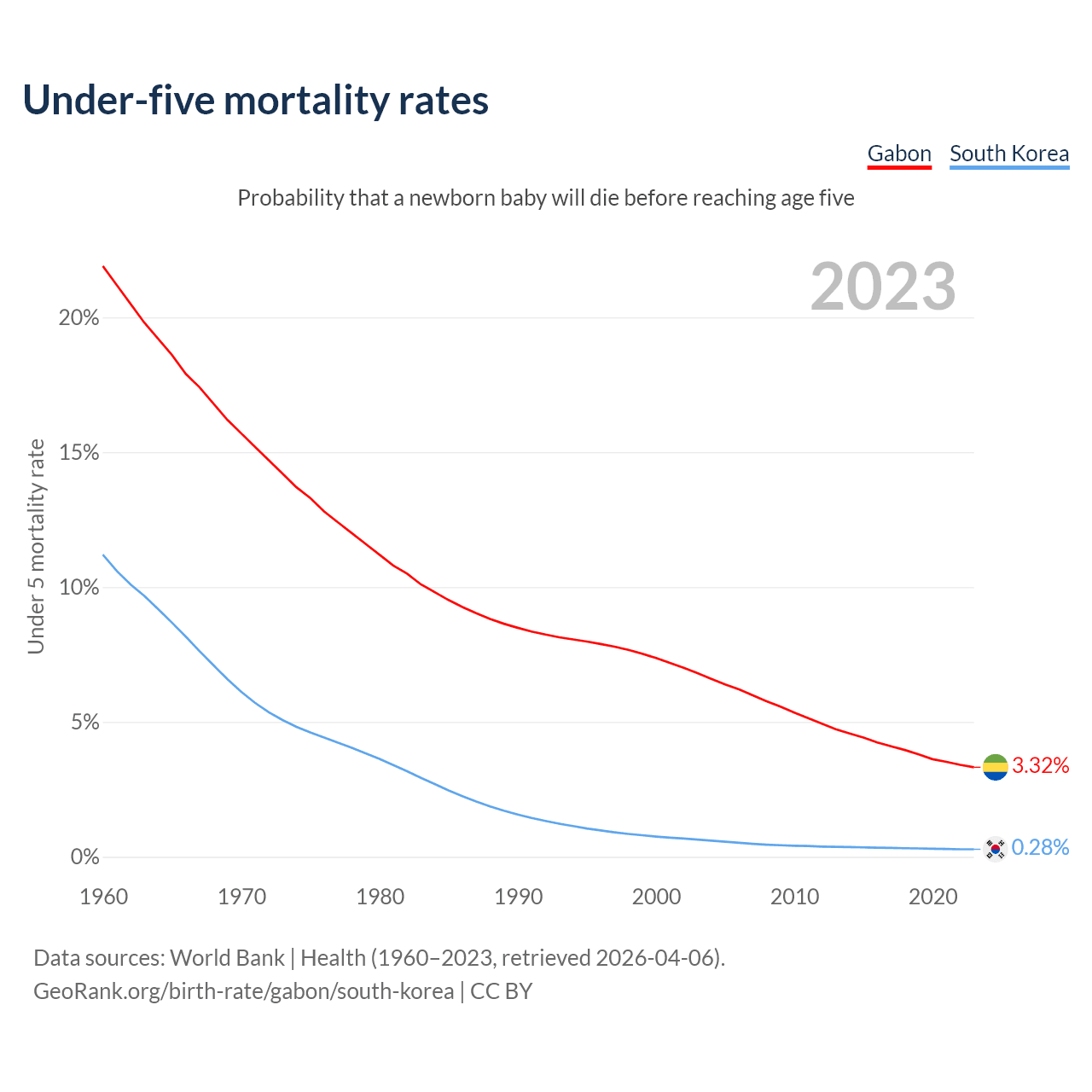 The chance that a newborn baby will die before reaching age five is 3.32% in Gabon and 0.28% in South Korea. Above is a chart with historical data on under-five mortality rates.