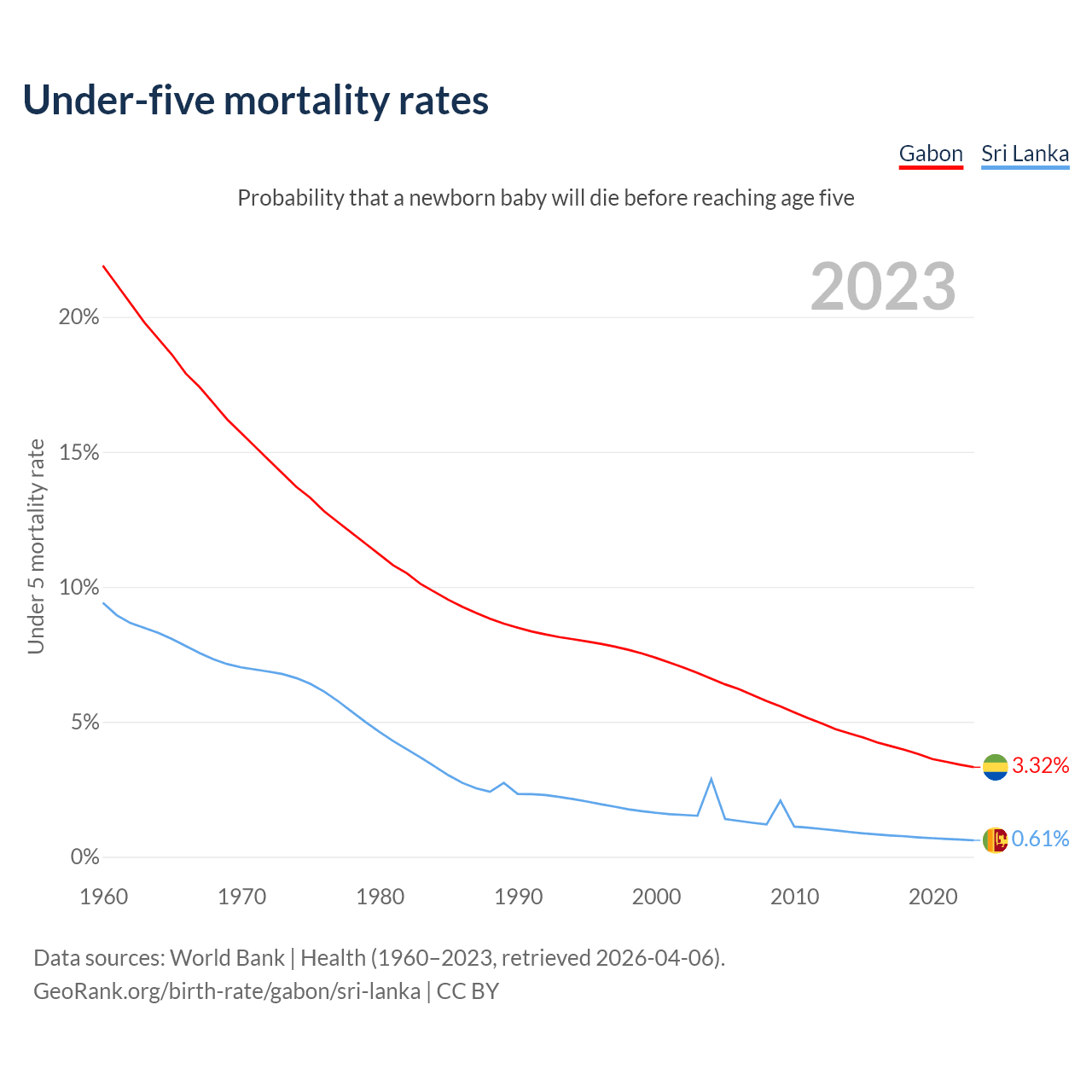 The chance that a newborn baby will die before reaching age five is 3.32% in Gabon and 0.61% in Sri Lanka. Above is a chart with historical data on under-five mortality rates.