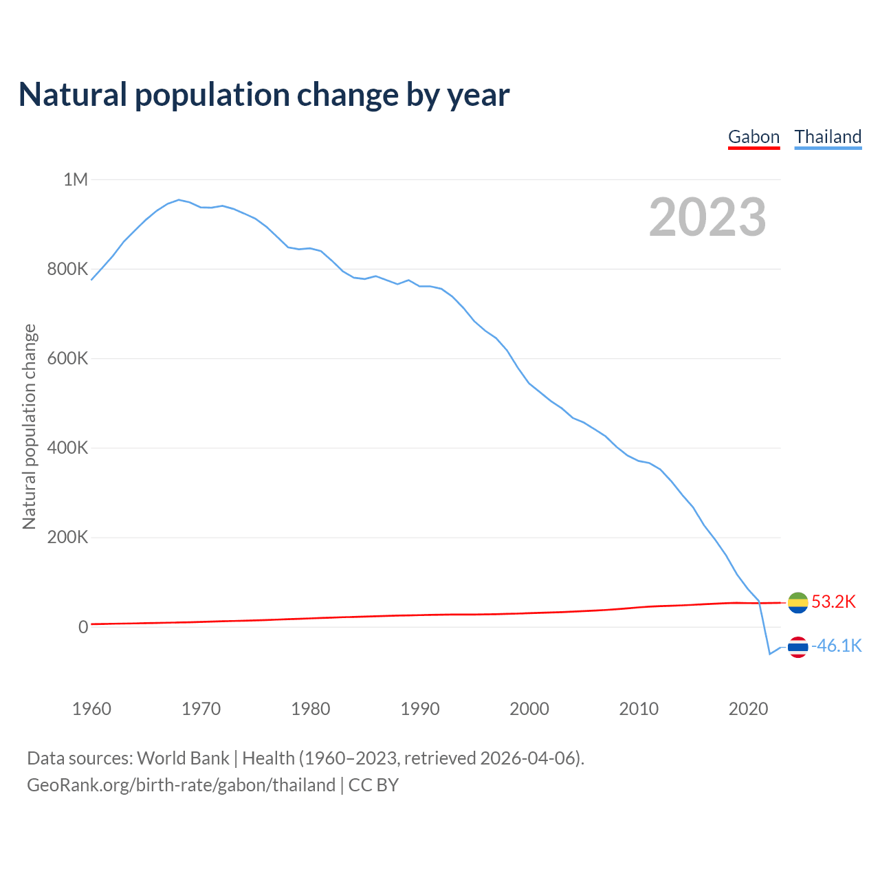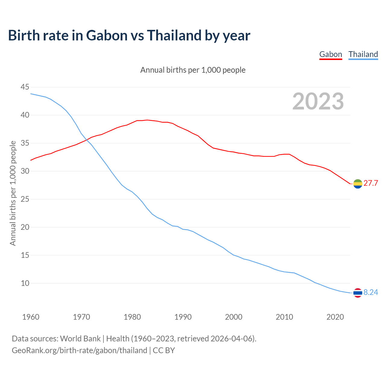 Gabon has an annual birth rate of 27.7 births per 1,000 people, compared to 8.24 for Thailand. The average number of children a woman is expected to have during her lifetime — the fertility rate, is 3.65 in Gabon and 1.21 in Thailand — 66.8% difference.