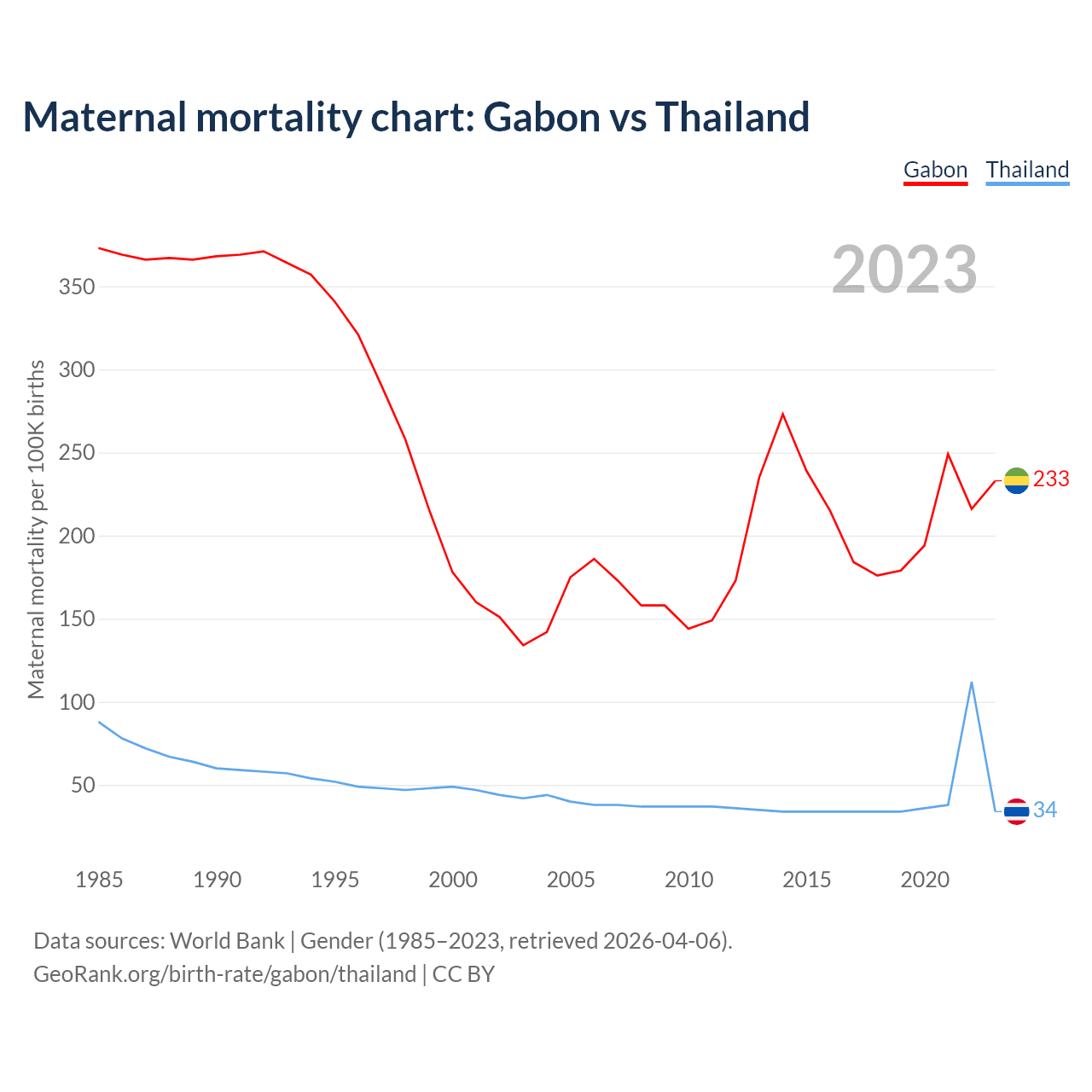 The maternal mortality rate, which is the probability of dying during childbirth or within 42 days of pregnancy termination, is 233 deaths per 100,000 live births in Gabon, compared to 34 deaths in Thailand.