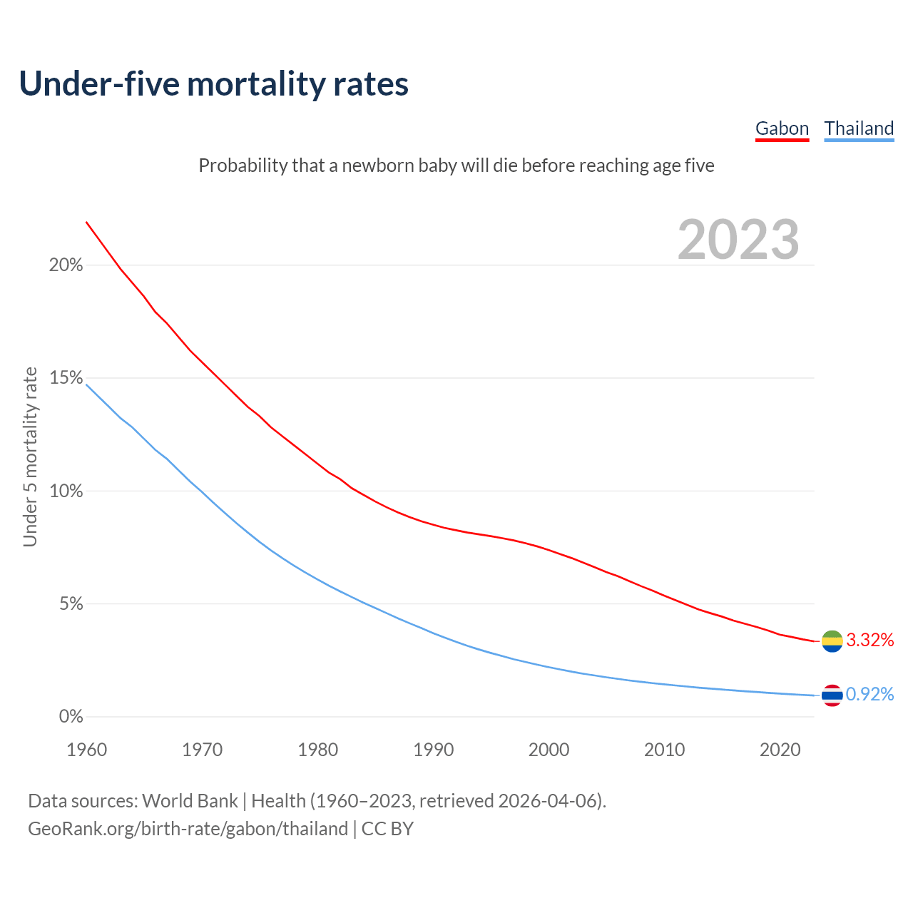 The chance that a newborn baby will die before reaching age five is 3.32% in Gabon and 0.92% in Thailand. Above is a chart with historical data on under-five mortality rates.