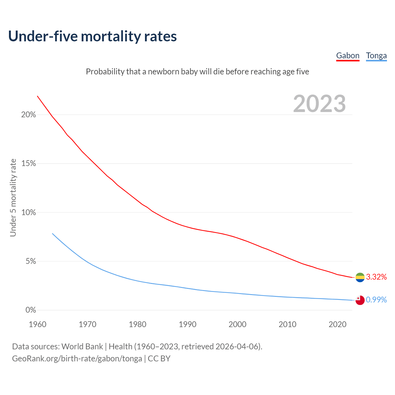 The chance that a newborn baby will die before reaching age five is 3.32% in Gabon and 0.99% in Tonga. Above is a chart with historical data on under-five mortality rates.