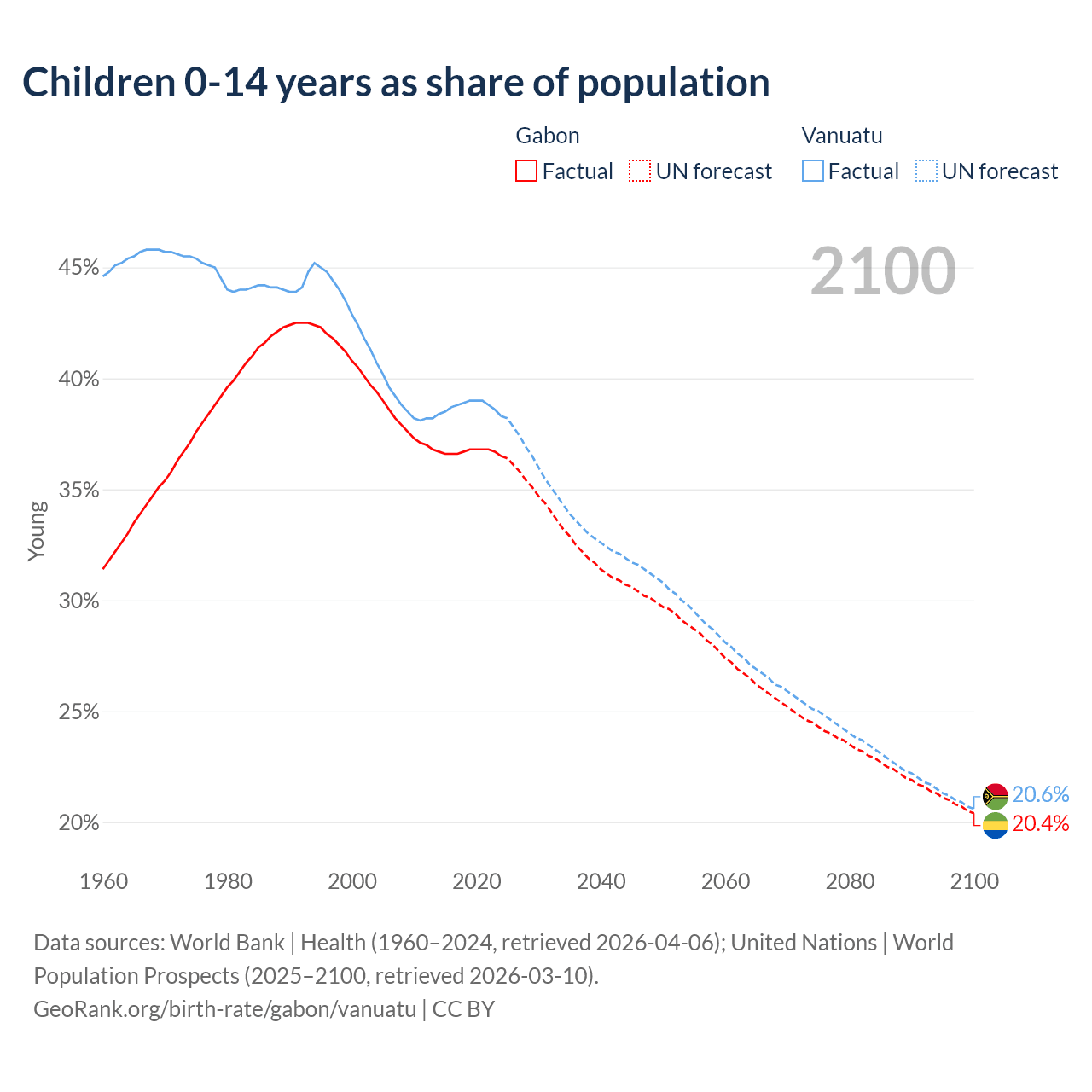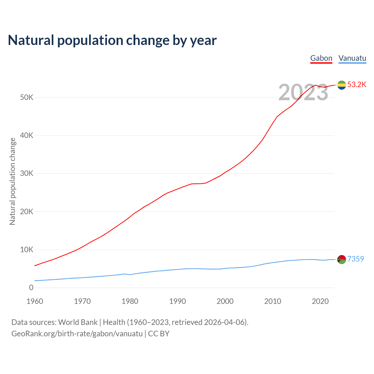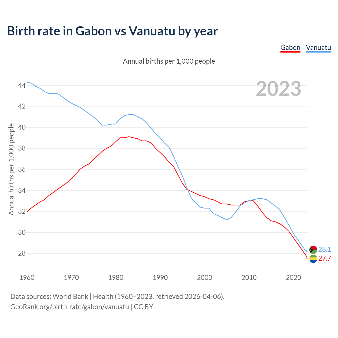 Gabon has an annual birth rate of 27.7 births per 1,000 people, compared to 28.1 for Vanuatu. The average number of children a woman is expected to have during her lifetime — the fertility rate, is 3.65 in Gabon and 3.6 in Vanuatu — 1.4% difference.