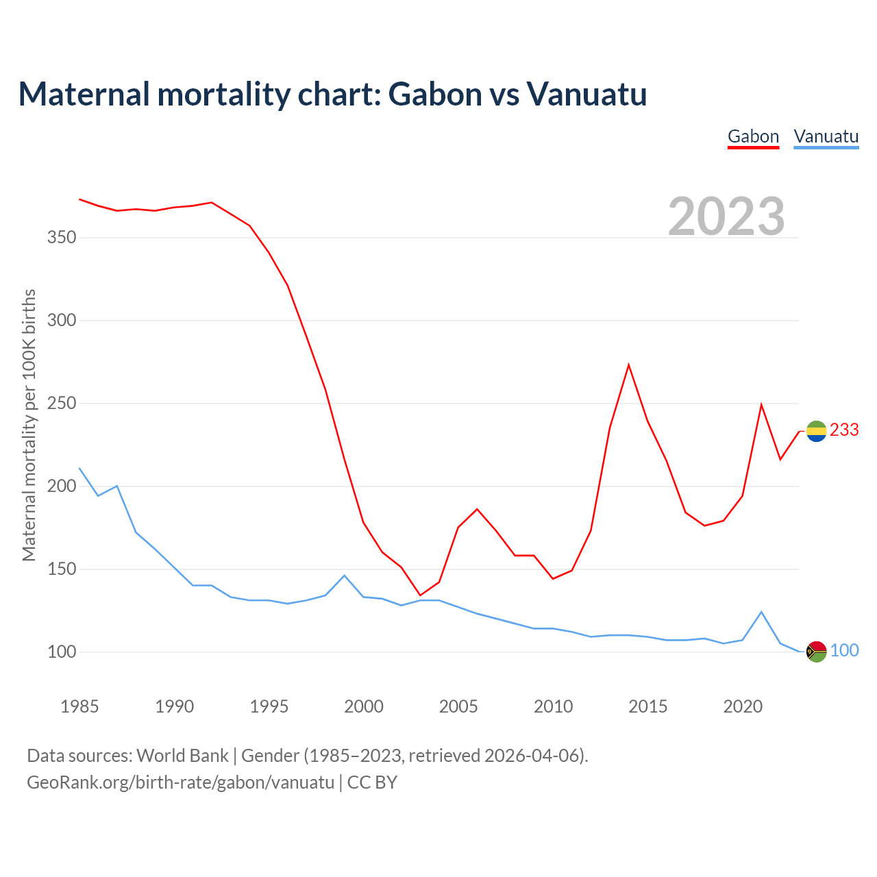 The maternal mortality rate, which is the probability of dying during childbirth or within 42 days of pregnancy termination, is 233 deaths per 100,000 live births in Gabon, compared to 100 deaths in Vanuatu.