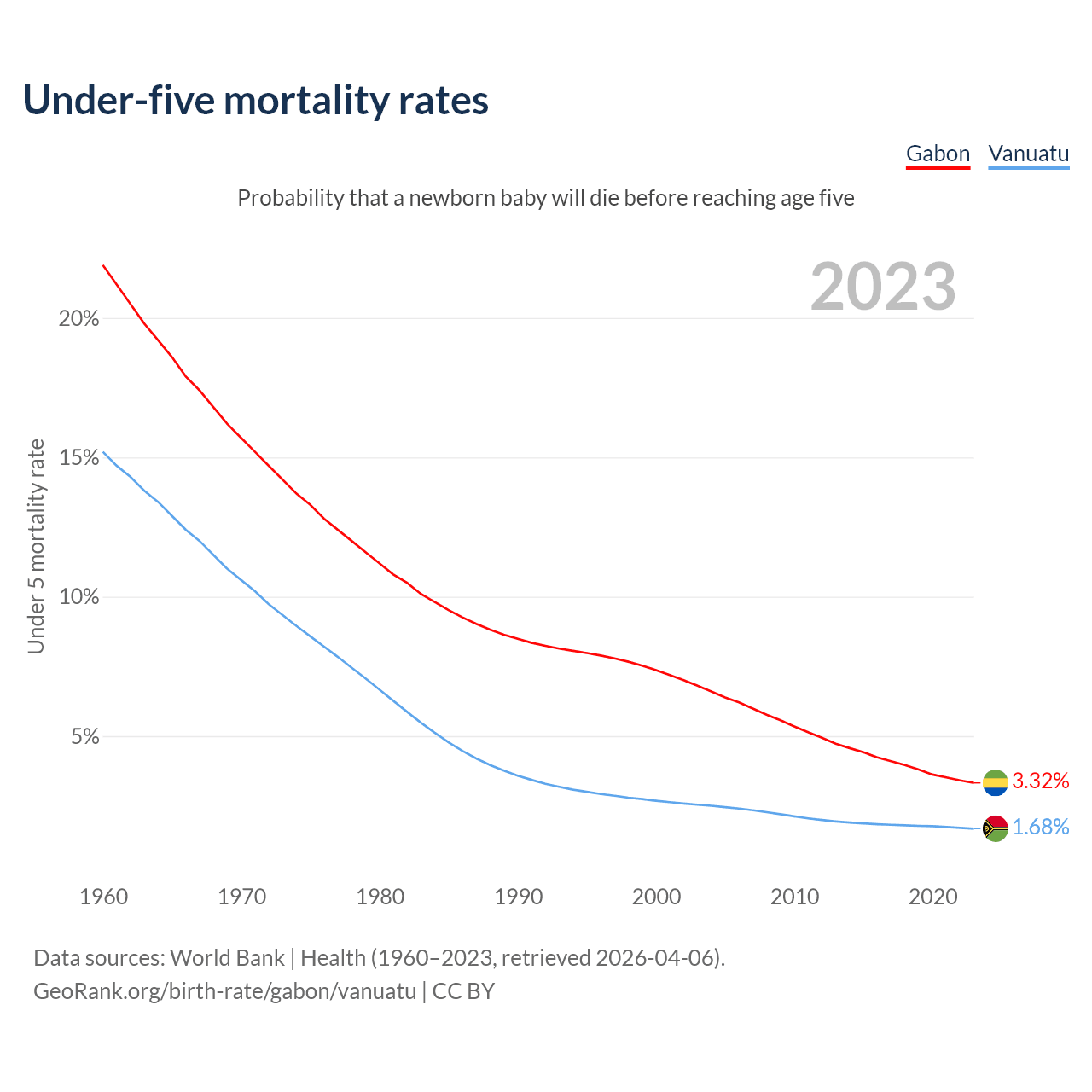 The chance that a newborn baby will die before reaching age five is 3.32% in Gabon and 1.68% in Vanuatu. Above is a chart with historical data on under-five mortality rates.