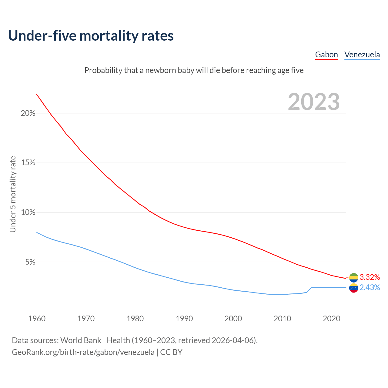 The chance that a newborn baby will die before reaching age five is 3.32% in Gabon and 2.43% in Venezuela. Above is a chart with historical data on under-five mortality rates.