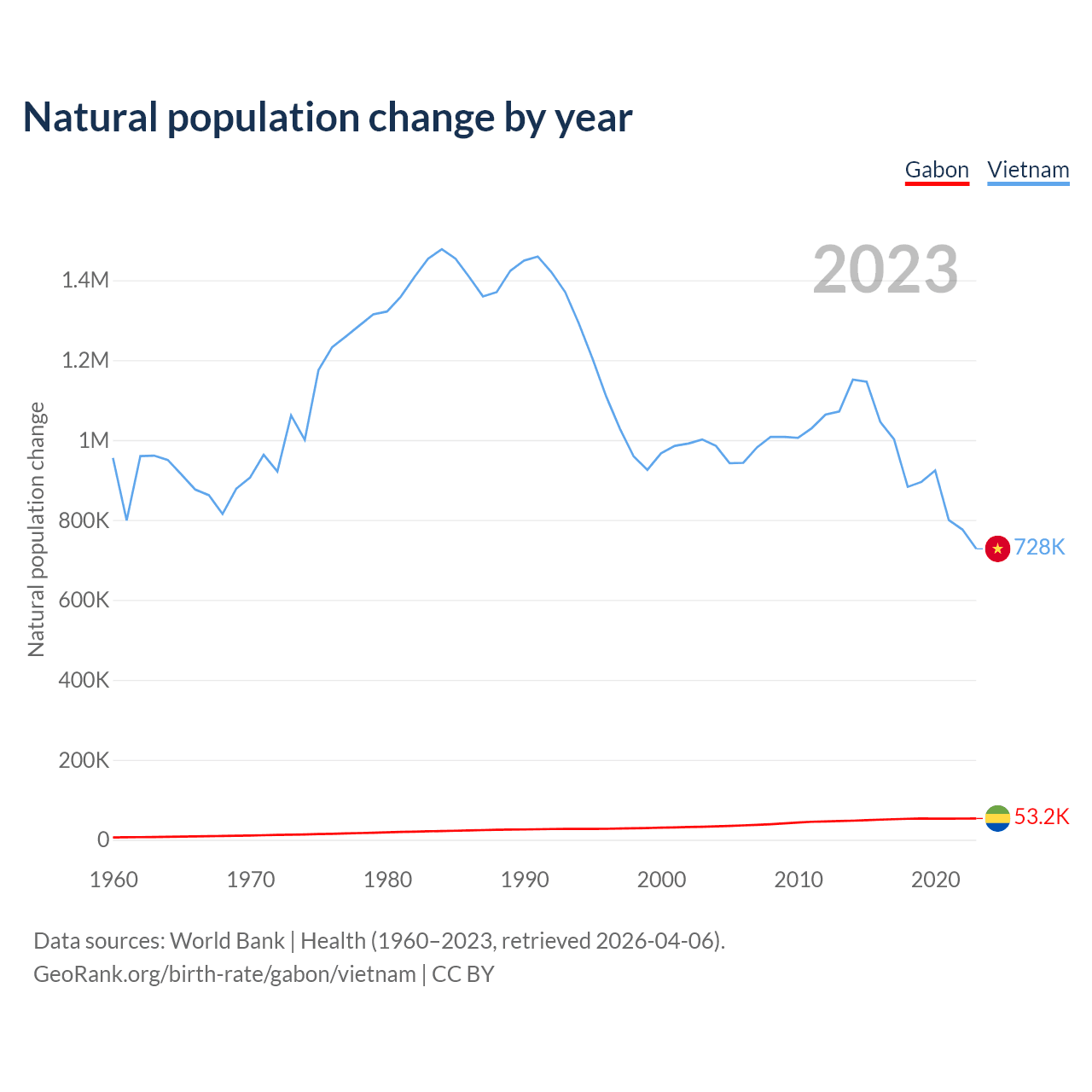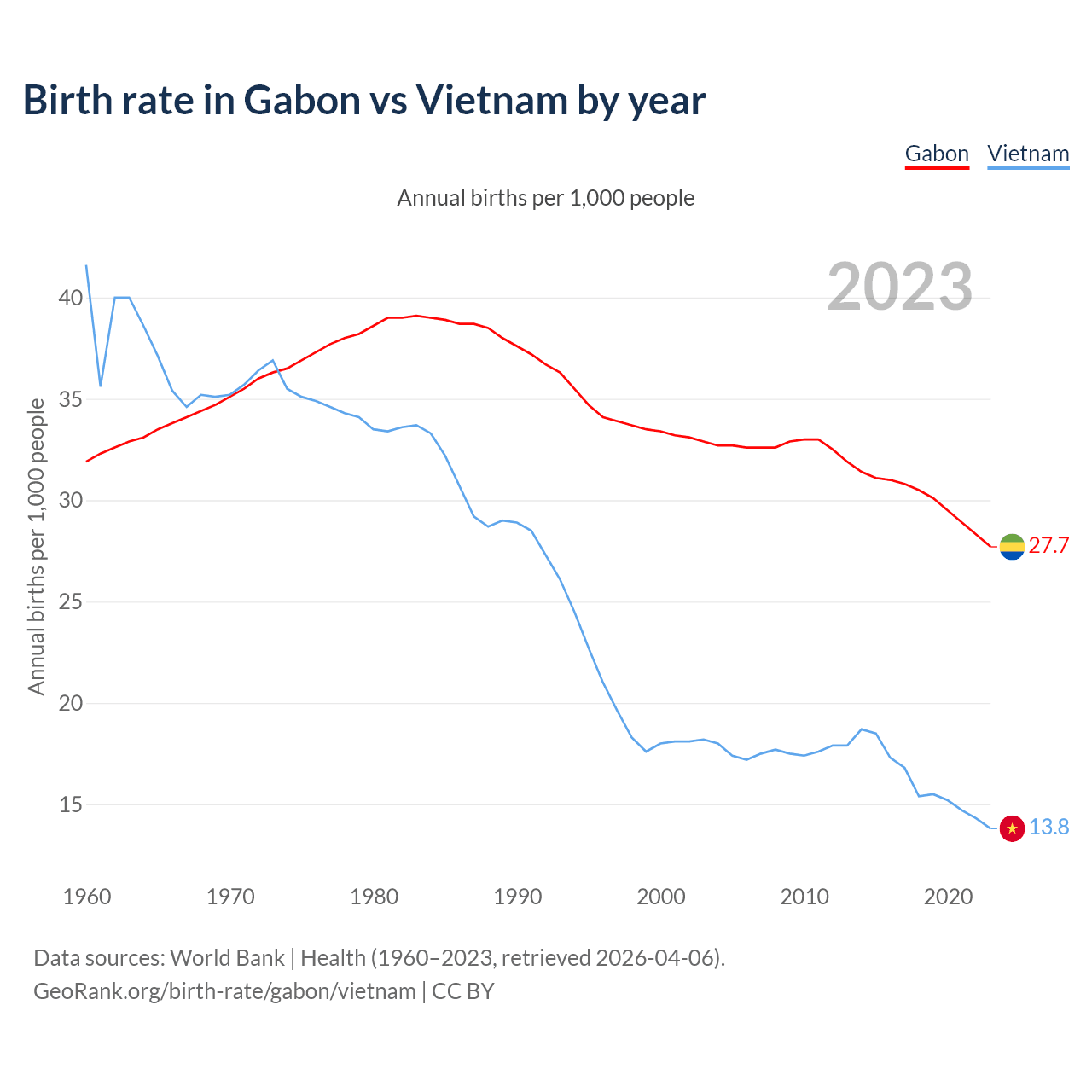 Gabon has an annual birth rate of 27.7 births per 1,000 people, compared to 13.8 for Vietnam. The average number of children a woman is expected to have during her lifetime — the fertility rate, is 3.65 in Gabon and 1.91 in Vietnam — 47.5% difference.