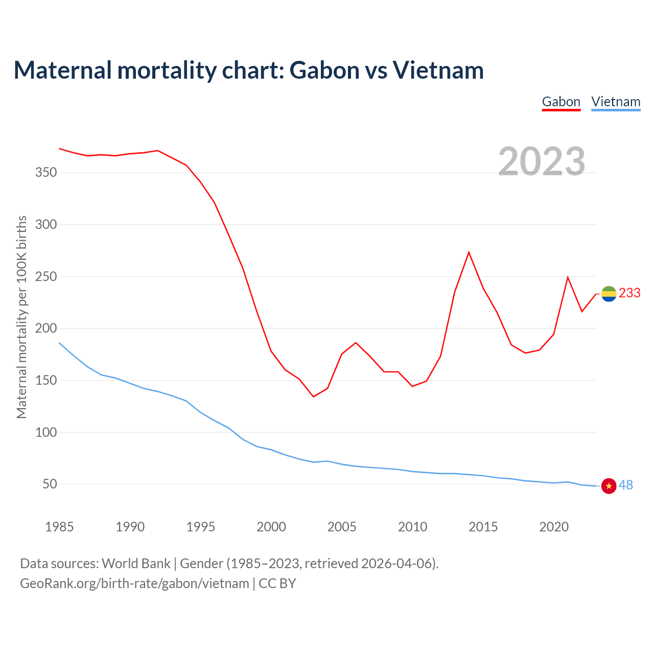 The maternal mortality rate, which is the probability of dying during childbirth or within 42 days of pregnancy termination, is 233 deaths per 100,000 live births in Gabon, compared to 48 deaths in Vietnam.