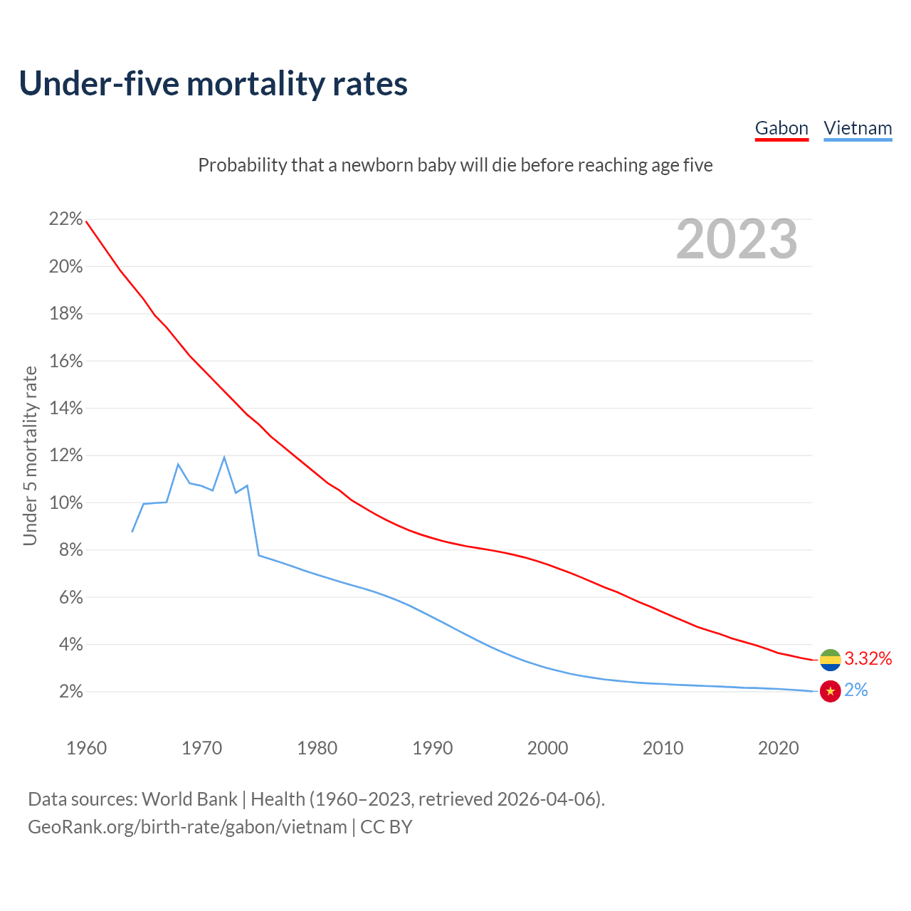 The chance that a newborn baby will die before reaching age five is 3.32% in Gabon and 2% in Vietnam. Above is a chart with historical data on under-five mortality rates.