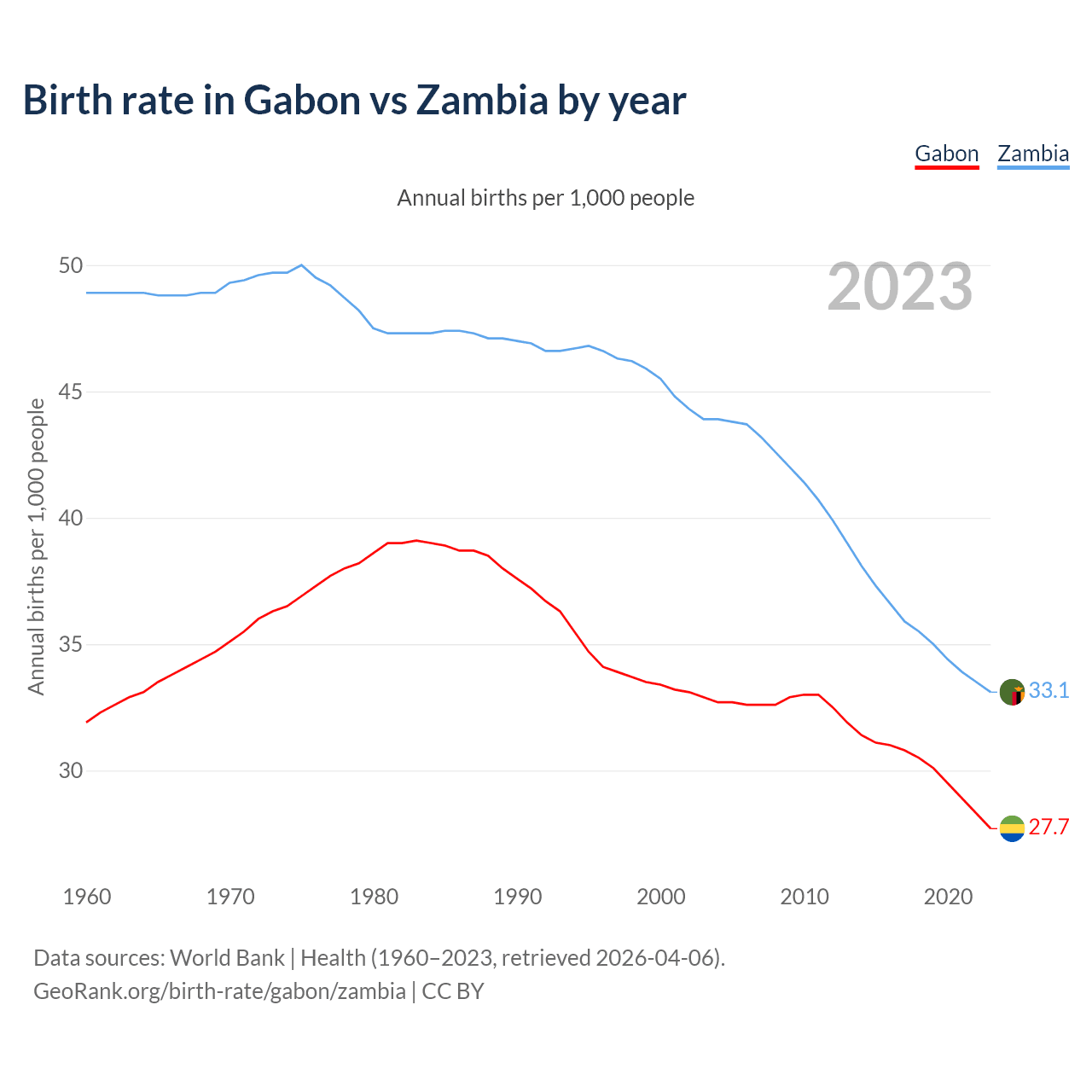 Gabon has an annual birth rate of 27.7 births per 1,000 people, compared to 33.1 for Zambia. The average number of children a woman is expected to have during her lifetime — the fertility rate, is 3.65 in Gabon and 4.1 in Zambia — 12.4% difference.