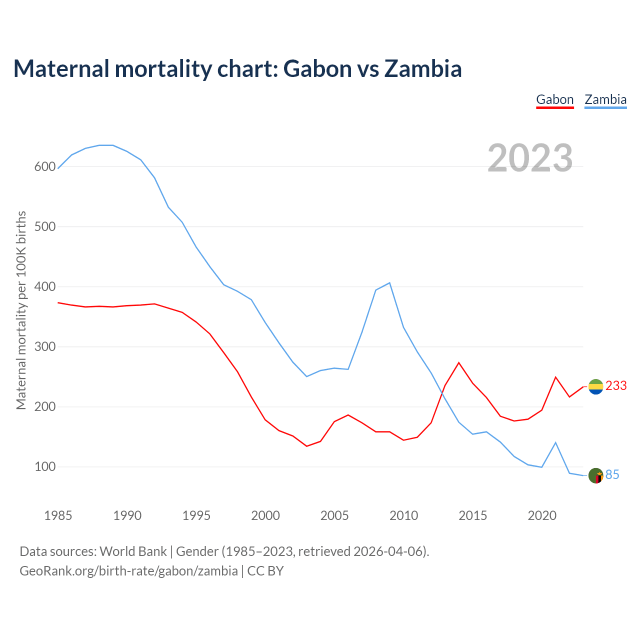 The maternal mortality rate, which is the probability of dying during childbirth or within 42 days of pregnancy termination, is 233 deaths per 100,000 live births in Gabon, compared to 85 deaths in Zambia.
