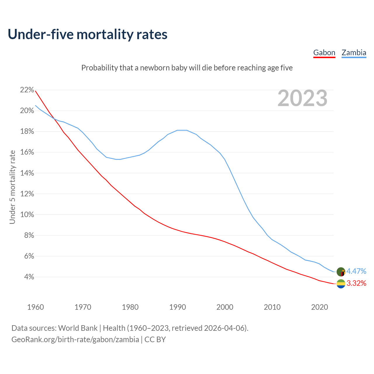 The chance that a newborn baby will die before reaching age five is 3.32% in Gabon and 4.47% in Zambia. Above is a chart with historical data on under-five mortality rates.