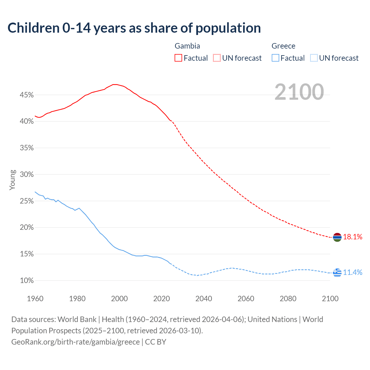 The Gambia has an annual birth rate of 30.4 births per 1,000 people, compared to 6.8 for Greece. The average number of children a woman is expected to have during her lifetime — the fertility rate, is 4.01 in the Gambia and 1.32 in Greece — 67% difference.