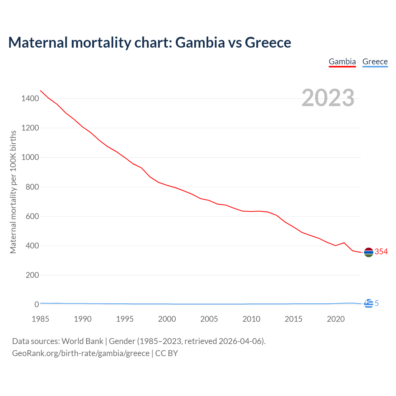 The maternal mortality rate, which is the probability of dying during childbirth or within 42 days of pregnancy termination, is 354 deaths per 100,000 live births in the Gambia, compared to 5 deaths in Greece.