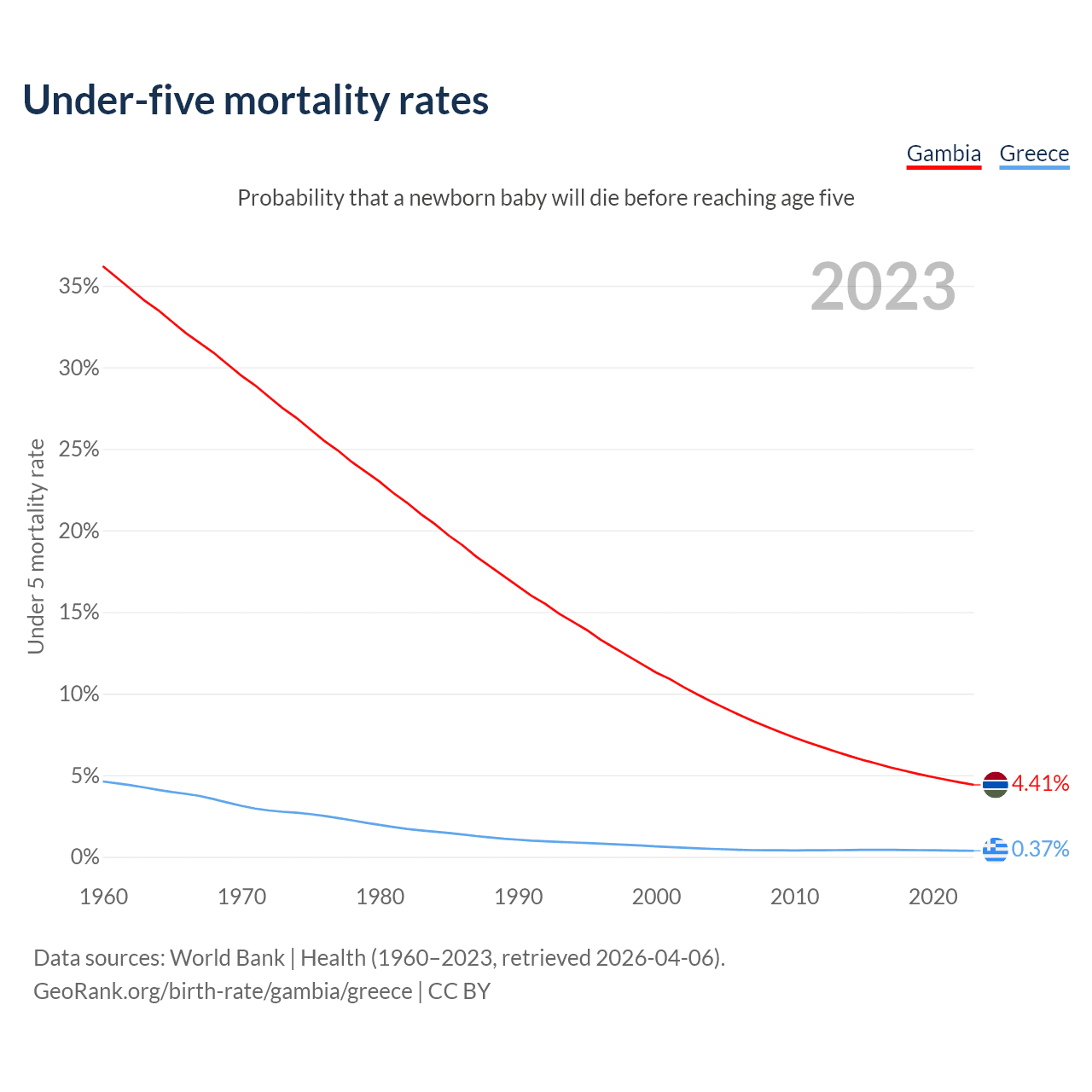 The chance that a newborn baby will die before reaching age five is 4.41% in the Gambia and 0.37% in Greece. Above is a chart with historical data on under-five mortality rates.