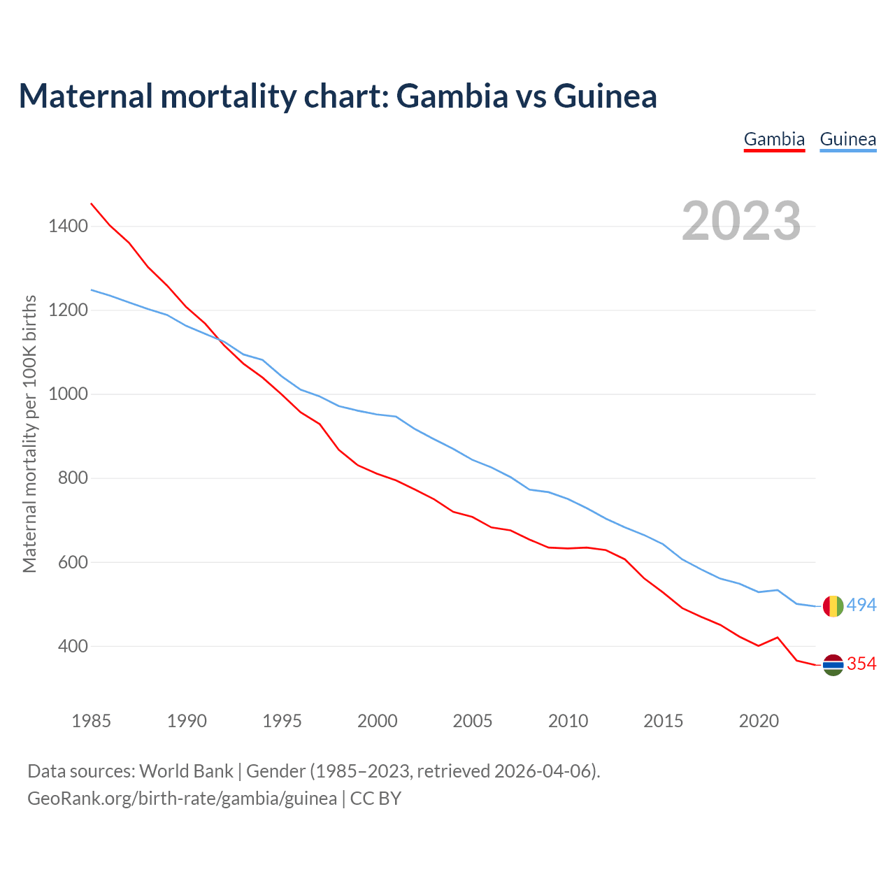 The maternal mortality rate, which is the probability of dying during childbirth or within 42 days of pregnancy termination, is 354 deaths per 100,000 live births in the Gambia, compared to 494 deaths in Guinea.