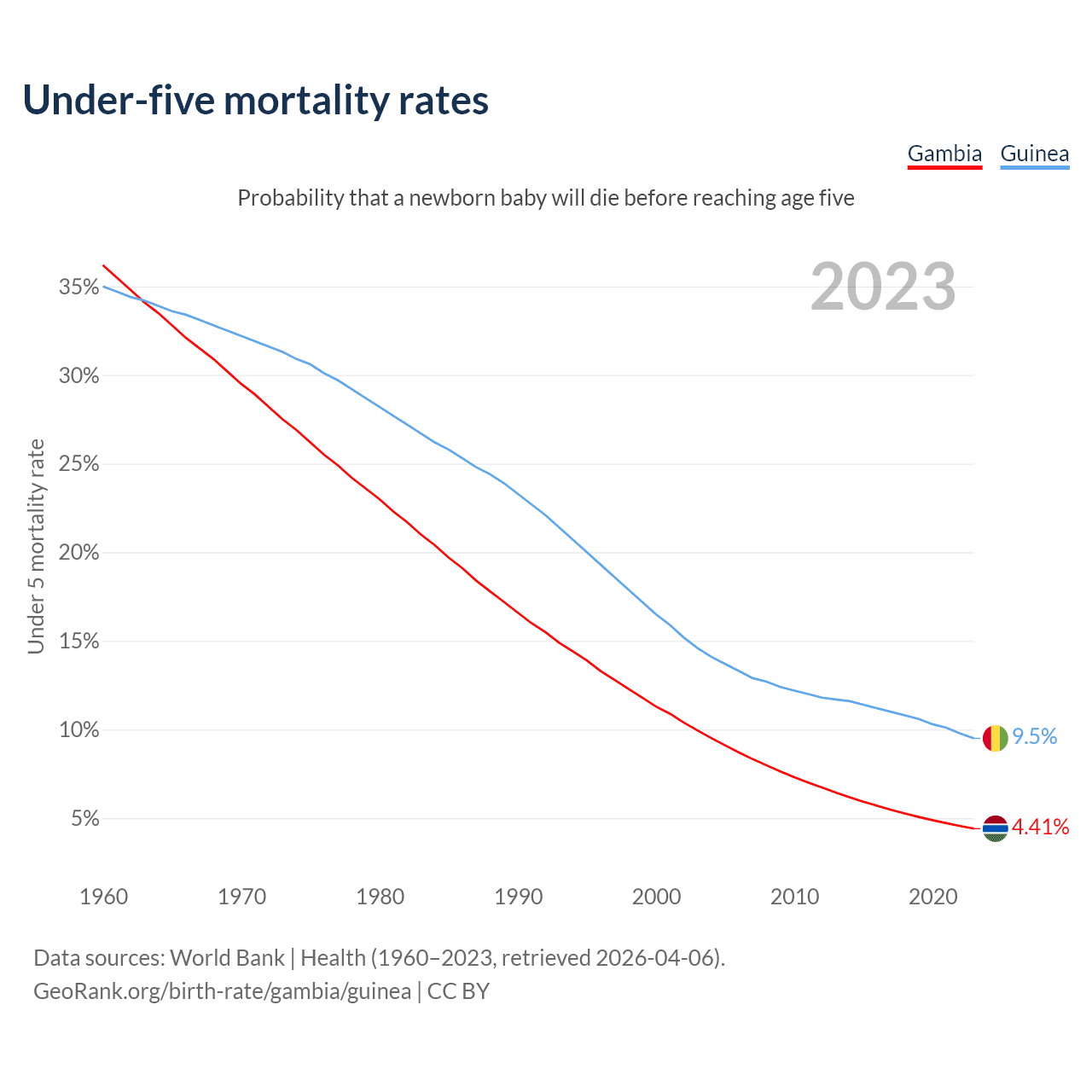 The chance that a newborn baby will die before reaching age five is 4.41% in the Gambia and 9.5% in Guinea. Above is a chart with historical data on under-five mortality rates.