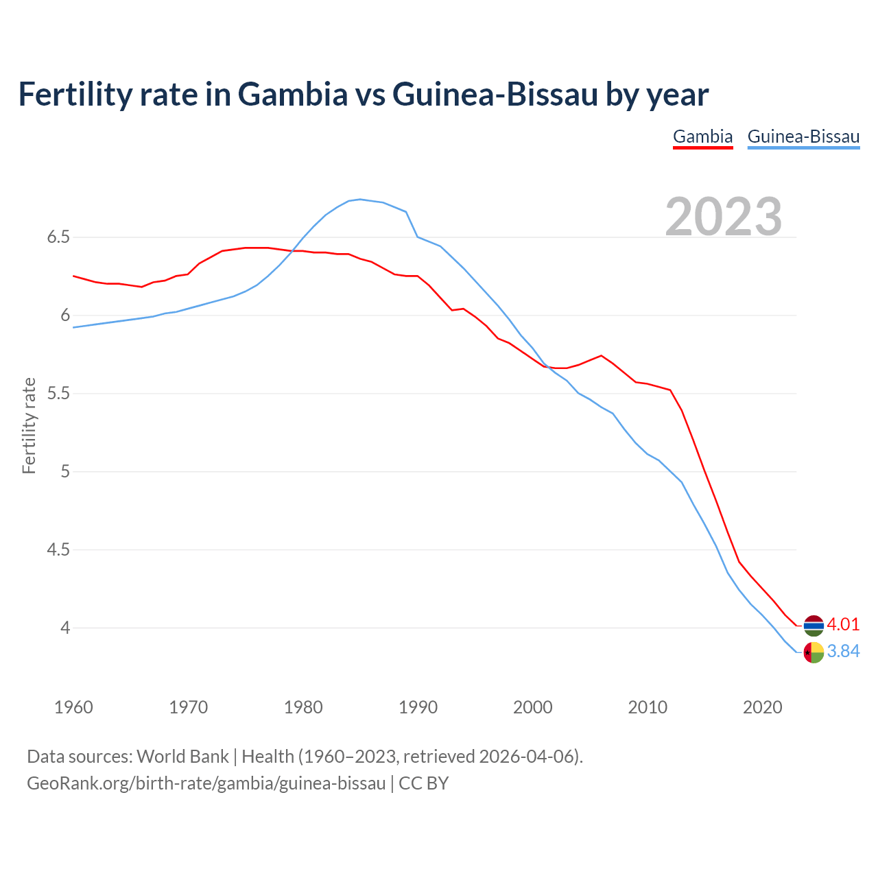1960 vs 2023, the fertility rate has decreased by 35.9% in the Gambia and by 35.2% in Guinea-Bissau — in 1960, it was 6.25 and 5.92, respectively.