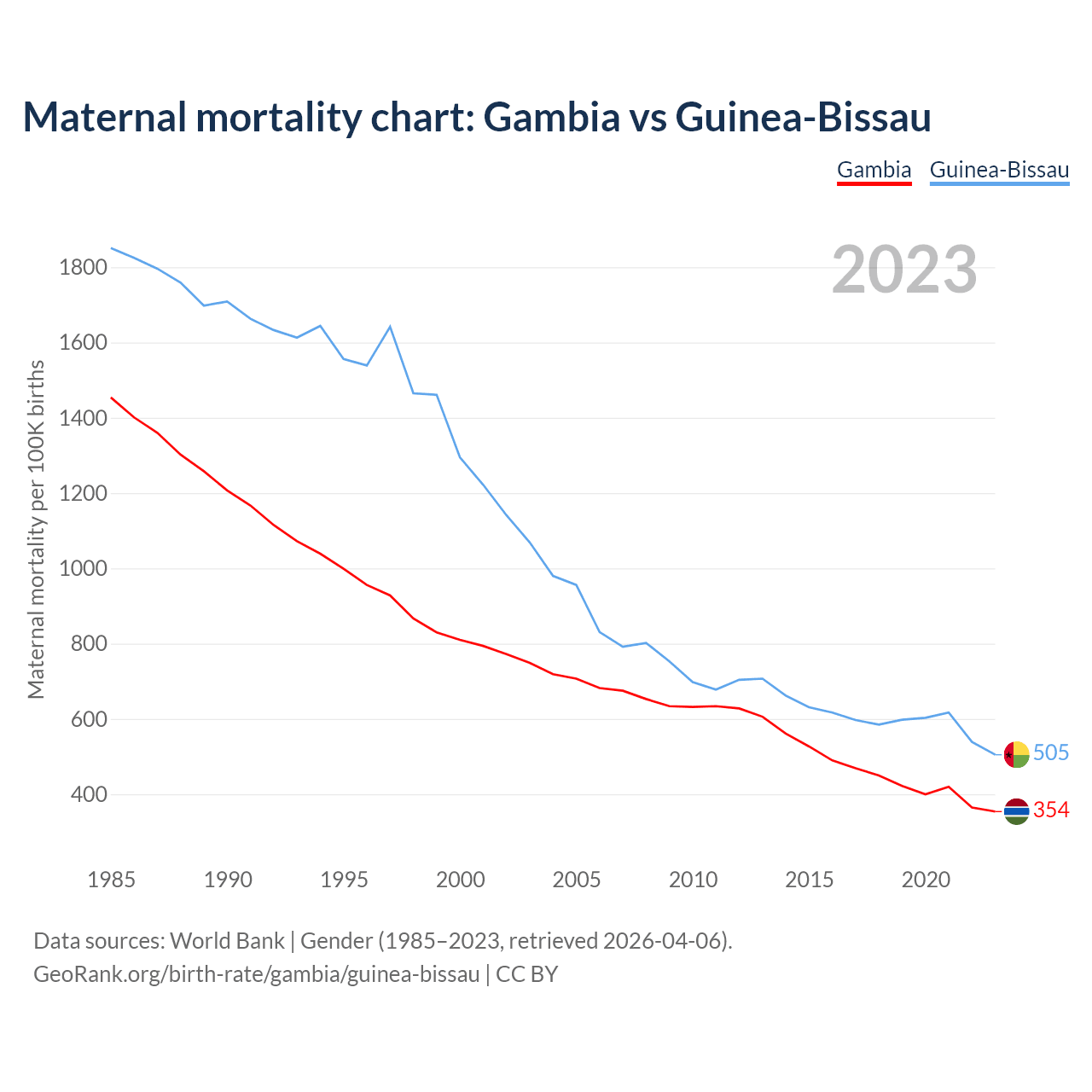 The maternal mortality rate, which is the probability of dying during childbirth or within 42 days of pregnancy termination, is 354 deaths per 100,000 live births in the Gambia, compared to 505 deaths in Guinea-Bissau.