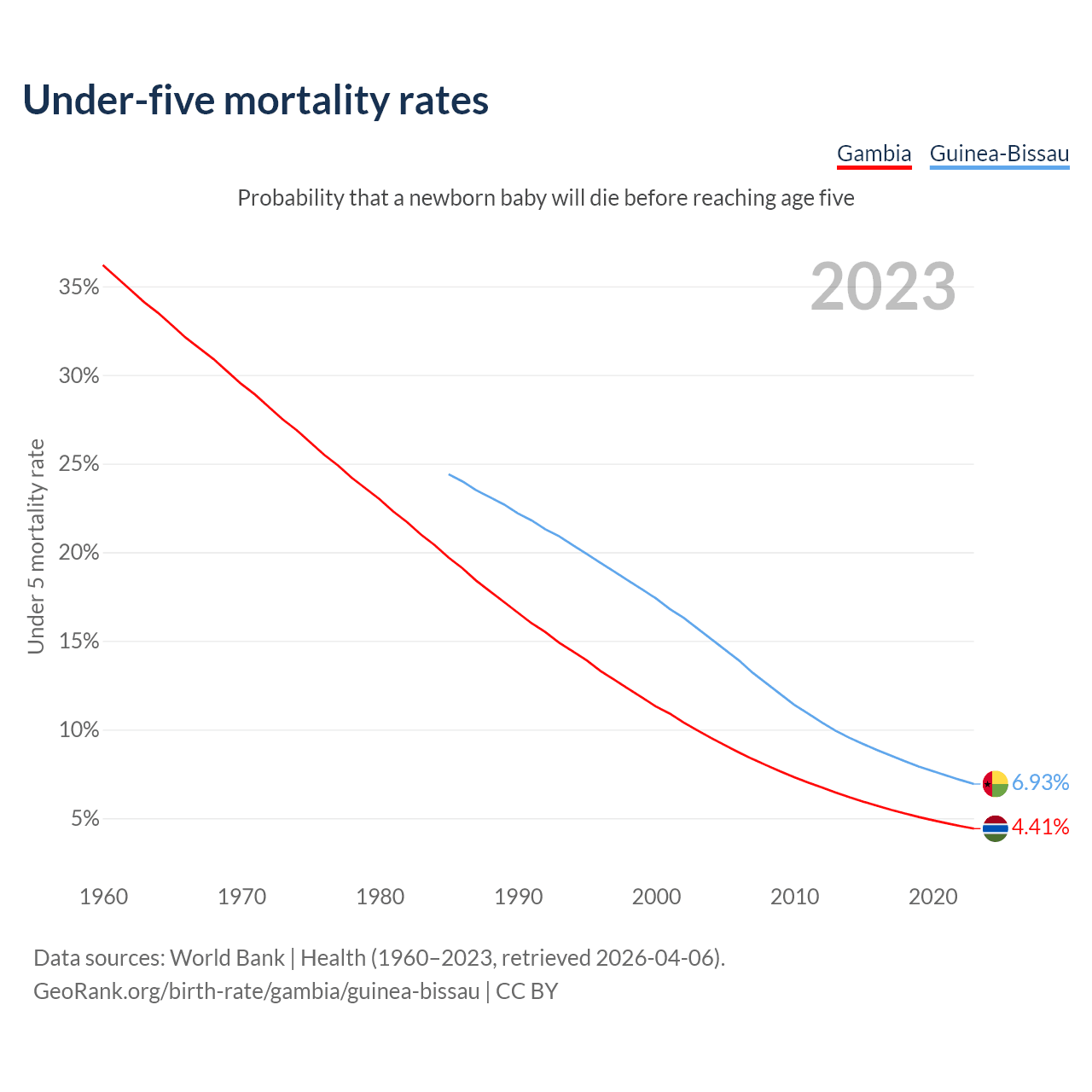 The chance that a newborn baby will die before reaching age five is 4.41% in the Gambia and 6.93% in Guinea-Bissau. Above is a chart with historical data on under-five mortality rates.