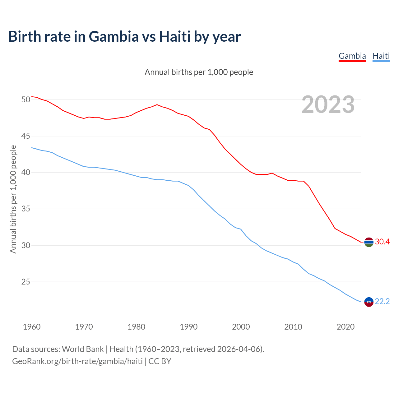The Gambia has an annual birth rate of 30.4 births per 1,000 people, compared to 22.2 for Haiti. The average number of children a woman is expected to have during her lifetime — the fertility rate, is 4.01 in the Gambia and 2.66 in Haiti — 33.7% difference.