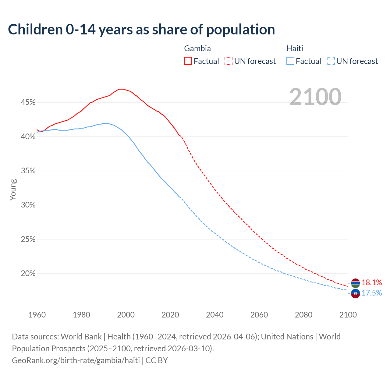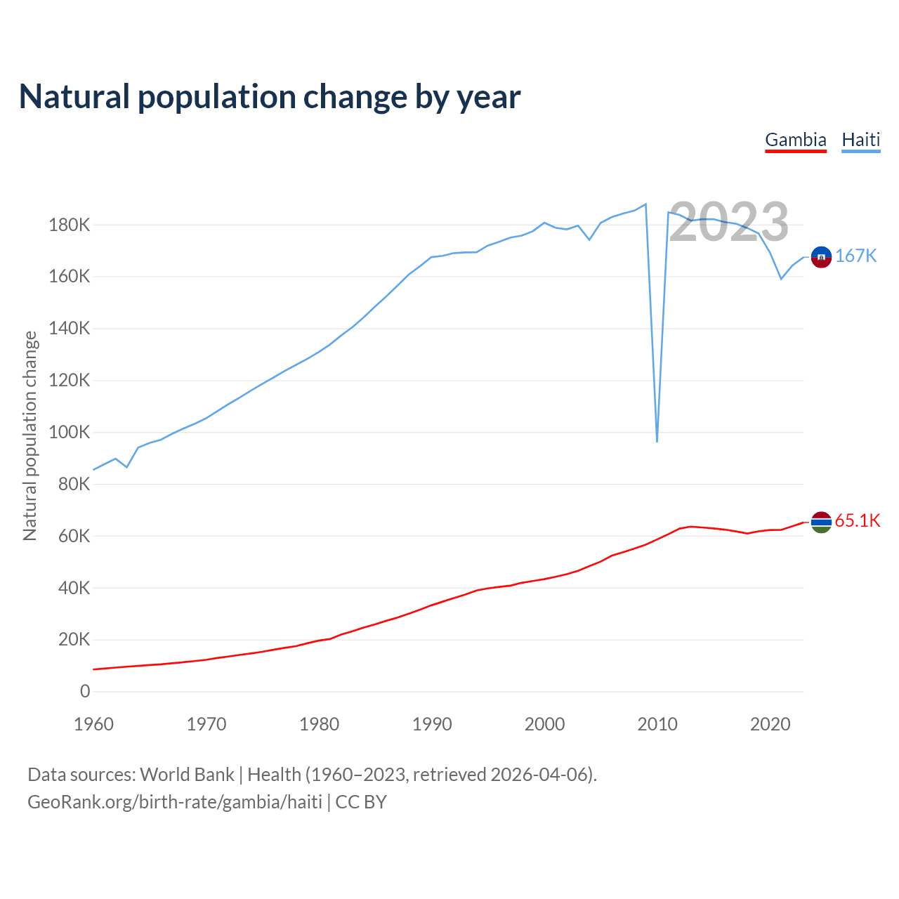 According to the latest available data on birth rates, the fertility rate in the Gambia was 4.01 children per woman in 2023, compared to 2.66 in Haiti in 2023. The replacement level is considered to be 2.1 children per woman.