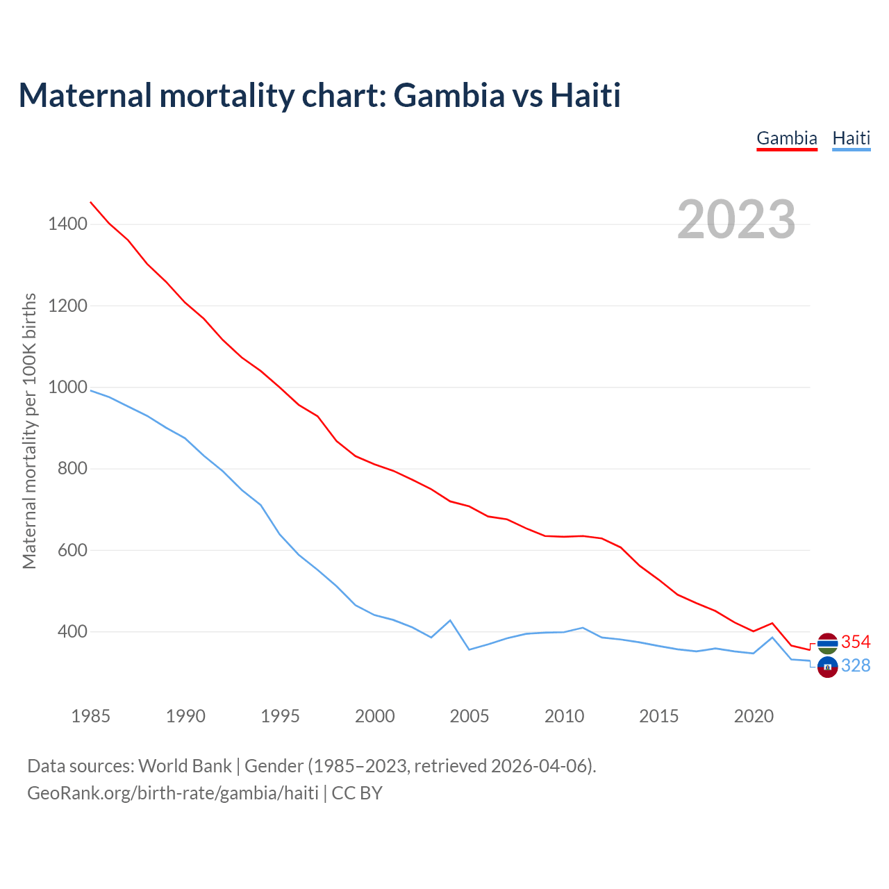 The maternal mortality rate, which is the probability of dying during childbirth or within 42 days of pregnancy termination, is 354 deaths per 100,000 live births in the Gambia, compared to 328 deaths in Haiti.