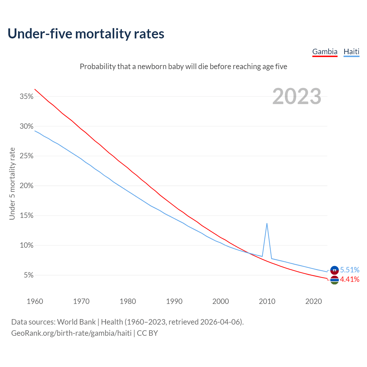The chance that a newborn baby will die before reaching age five is 4.41% in the Gambia and 5.51% in Haiti. Above is a chart with historical data on under-five mortality rates.