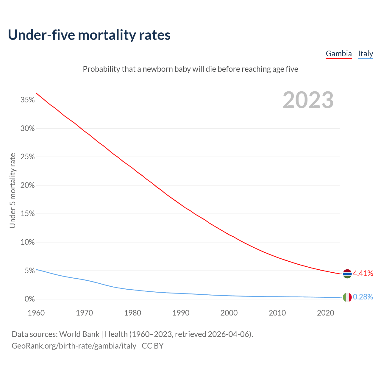 The chance that a newborn baby will die before reaching age five is 4.41% in the Gambia and 0.28% in Italy. Above is a chart with historical data on under-five mortality rates.