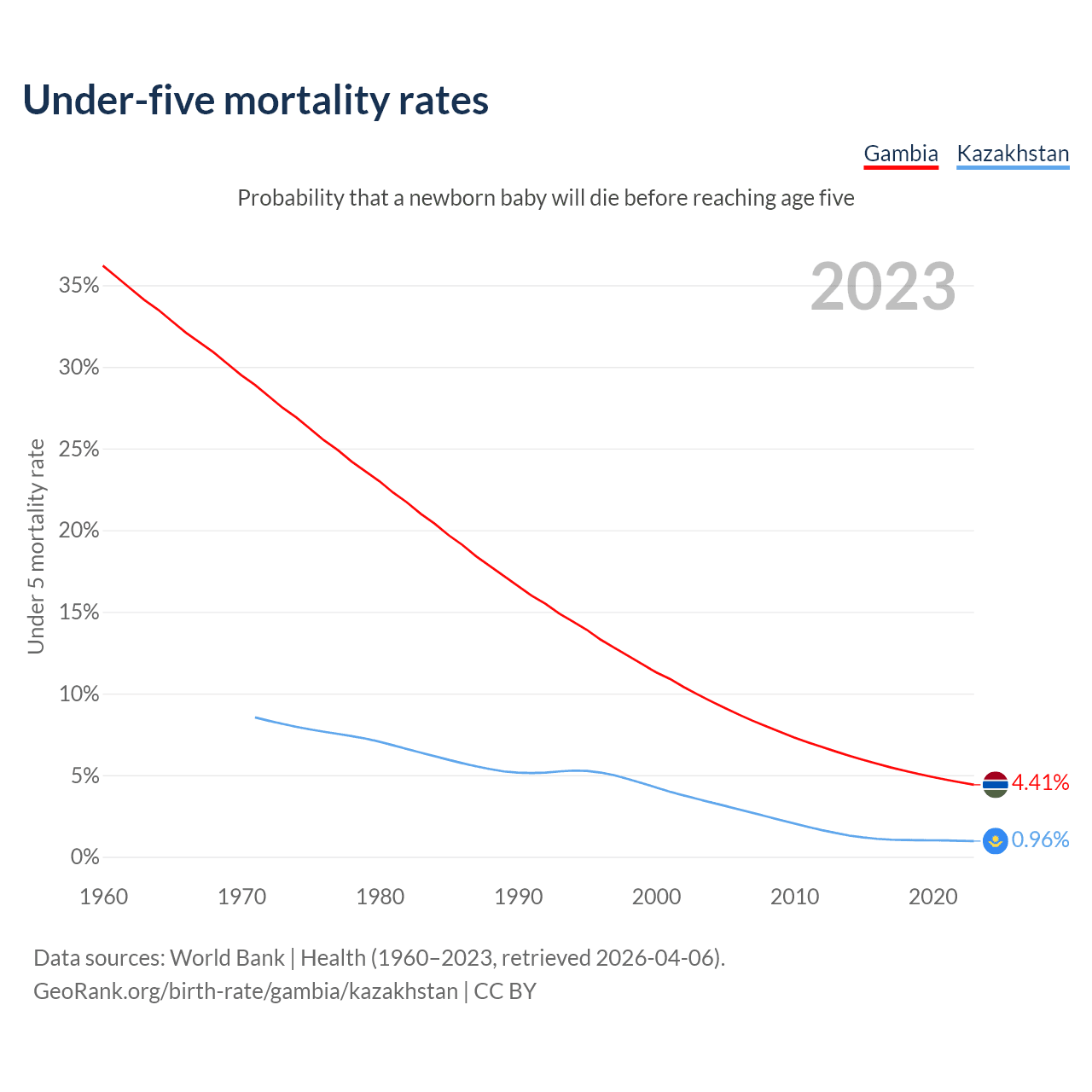The chance that a newborn baby will die before reaching age five is 4.41% in the Gambia and 0.96% in Kazakhstan. Above is a chart with historical data on under-five mortality rates.