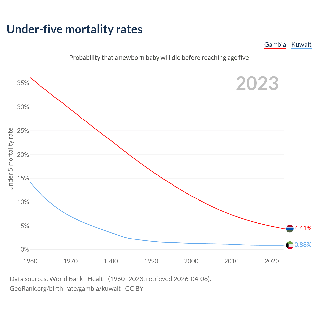 The chance that a newborn baby will die before reaching age five is 4.41% in the Gambia and 0.88% in Kuwait. Above is a chart with historical data on under-five mortality rates.