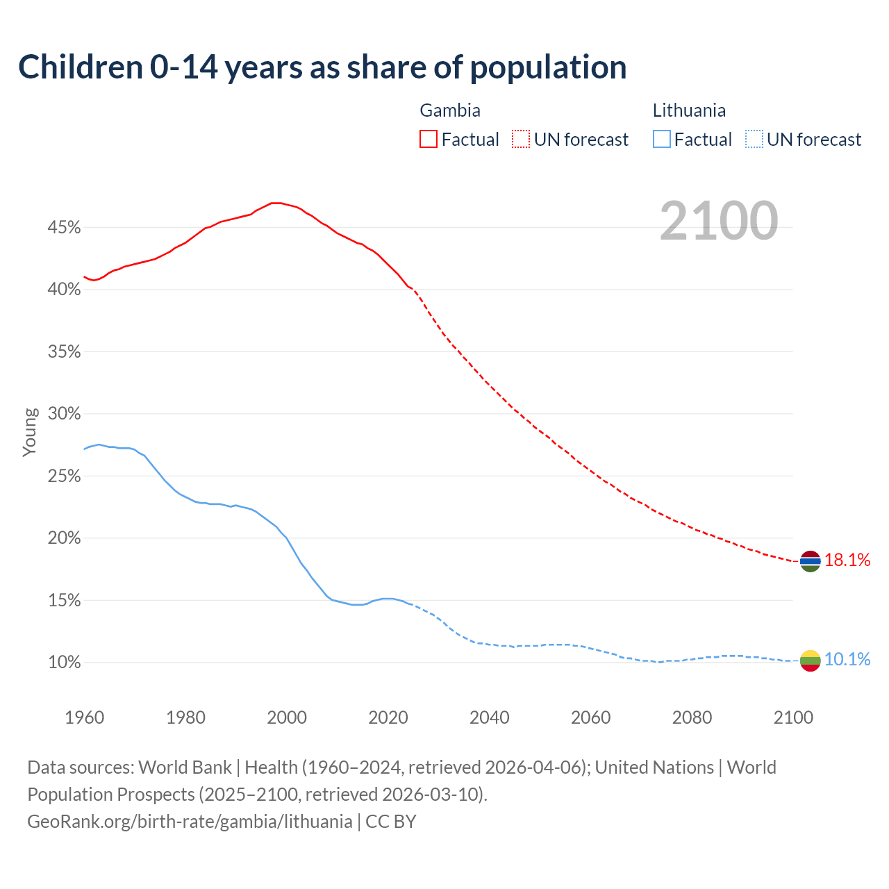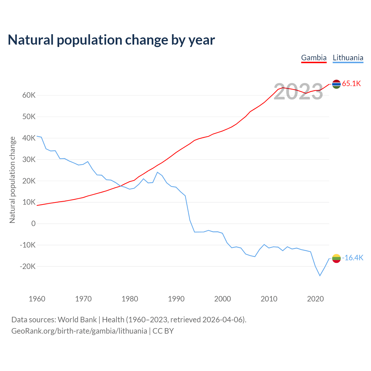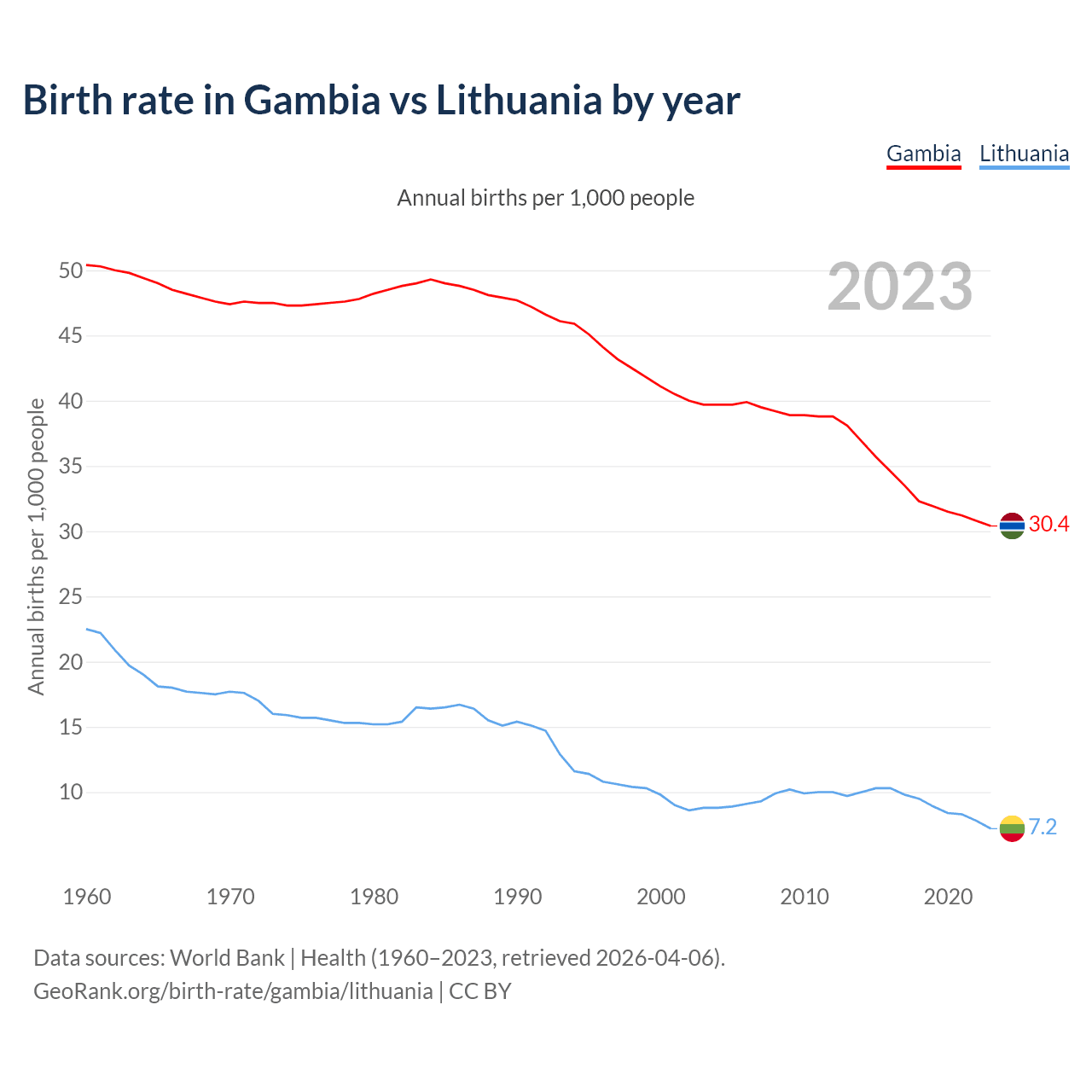 The Gambia has an annual birth rate of 30.4 births per 1,000 people, compared to 7.2 for Lithuania. The average number of children a woman is expected to have during her lifetime — the fertility rate, is 4.01 in the Gambia and 1.18 in Lithuania — 70.5% difference.