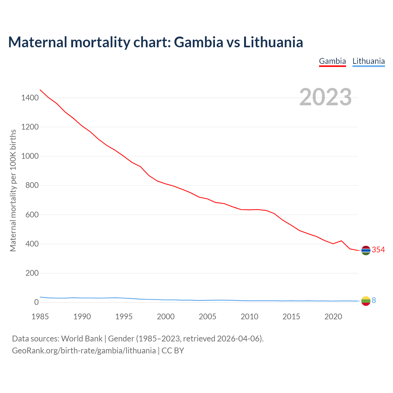 The maternal mortality rate, which is the probability of dying during childbirth or within 42 days of pregnancy termination, is 354 deaths per 100,000 live births in the Gambia, compared to 8 deaths in Lithuania.