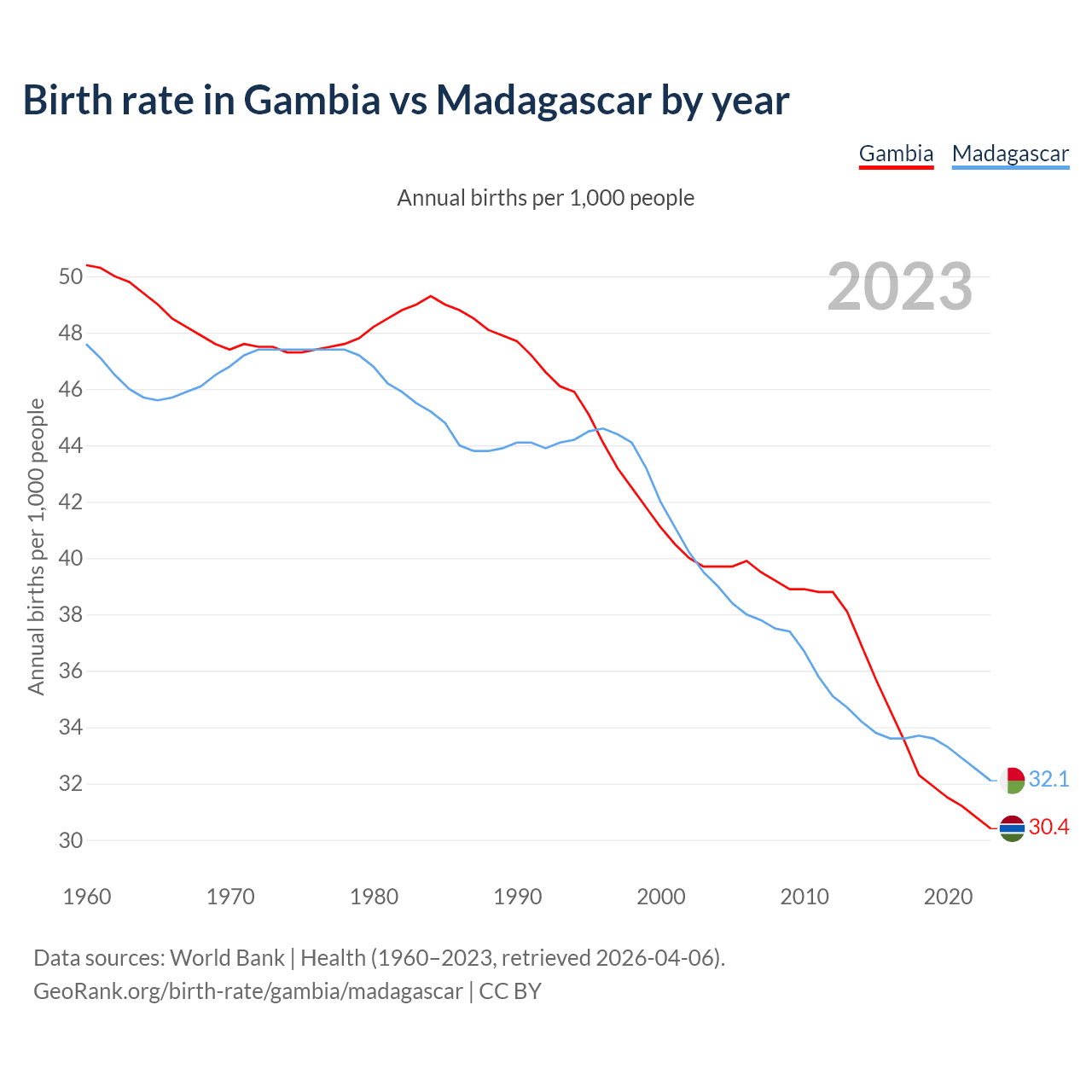 The Gambia has an annual birth rate of 30.4 births per 1,000 people, compared to 32.1 for Madagascar. The average number of children a woman is expected to have during her lifetime — the fertility rate, is 4.01 in the Gambia and 3.97 in Madagascar — 0.85% difference.