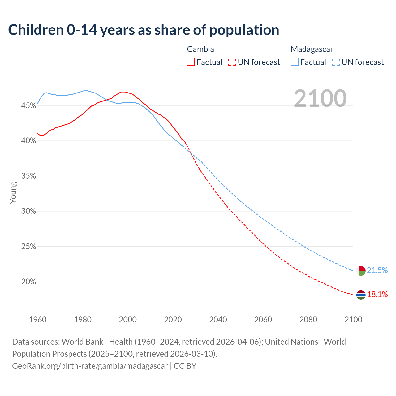 According to the latest available data on birth rates, the fertility rate in the Gambia was 4.01 children per woman in 2023, compared to 3.97 in Madagascar in 2023. The replacement level is considered to be 2.1 children per woman.