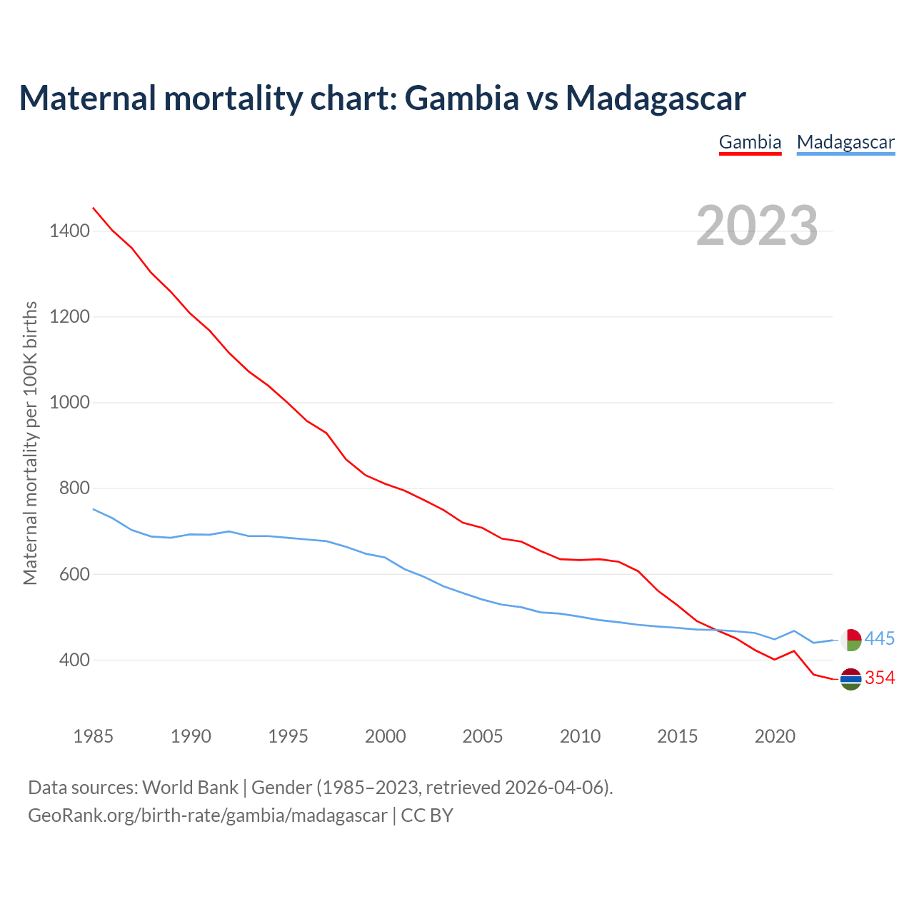 The maternal mortality rate, which is the probability of dying during childbirth or within 42 days of pregnancy termination, is 354 deaths per 100,000 live births in the Gambia, compared to 445 deaths in Madagascar.