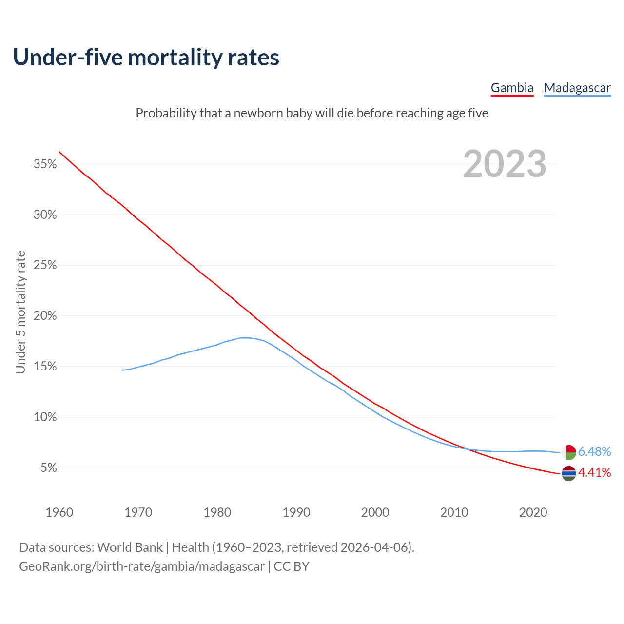 The chance that a newborn baby will die before reaching age five is 4.41% in the Gambia and 6.48% in Madagascar. Above is a chart with historical data on under-five mortality rates.