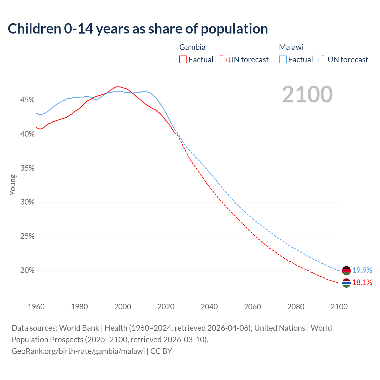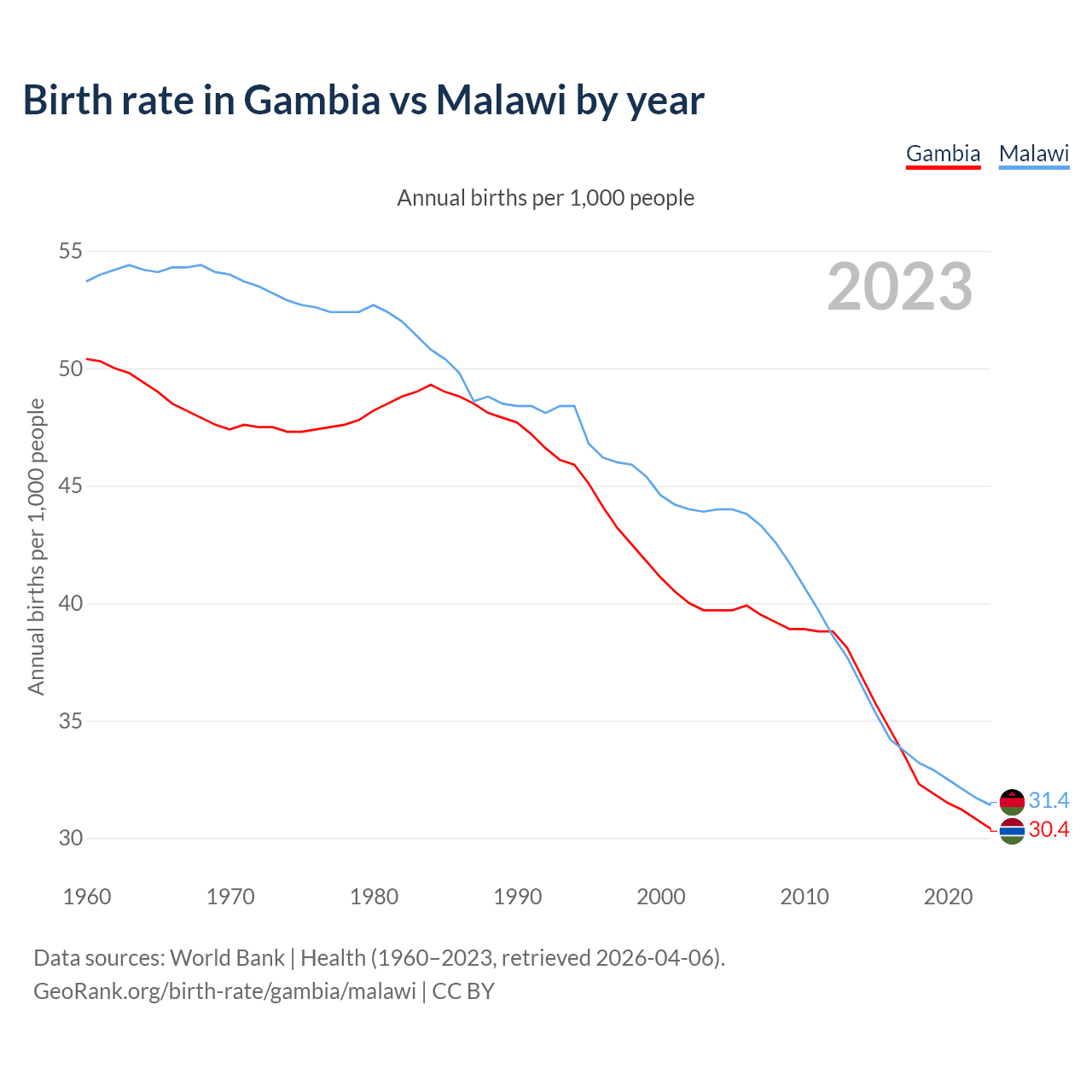 According to the latest available data on birth rates, the fertility rate in the Gambia was 4.01 children per woman in 2023, compared to 3.65 in Malawi in 2023. The replacement level is considered to be 2.1 children per woman.