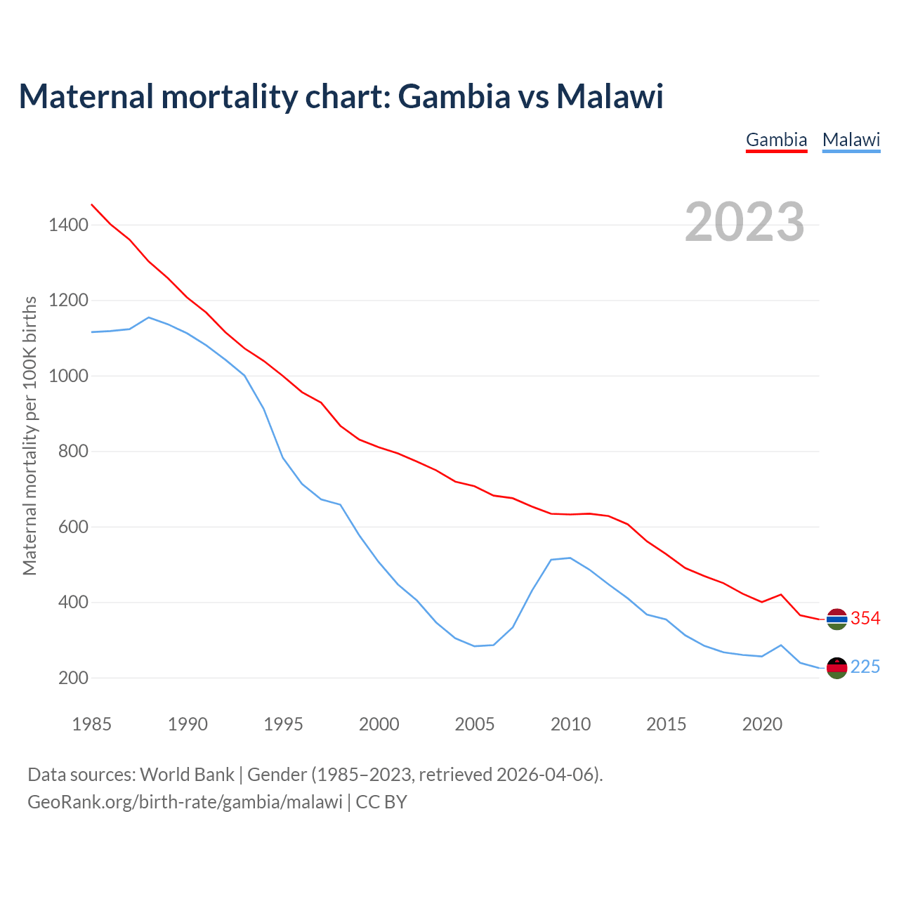 The maternal mortality rate, which is the probability of dying during childbirth or within 42 days of pregnancy termination, is 354 deaths per 100,000 live births in the Gambia, compared to 225 deaths in Malawi.