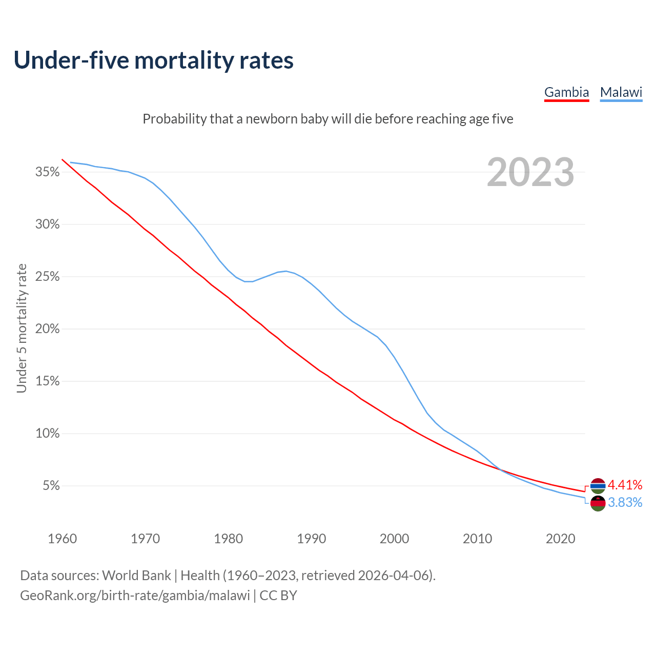 The chance that a newborn baby will die before reaching age five is 4.41% in the Gambia and 3.83% in Malawi. Above is a chart with historical data on under-five mortality rates.