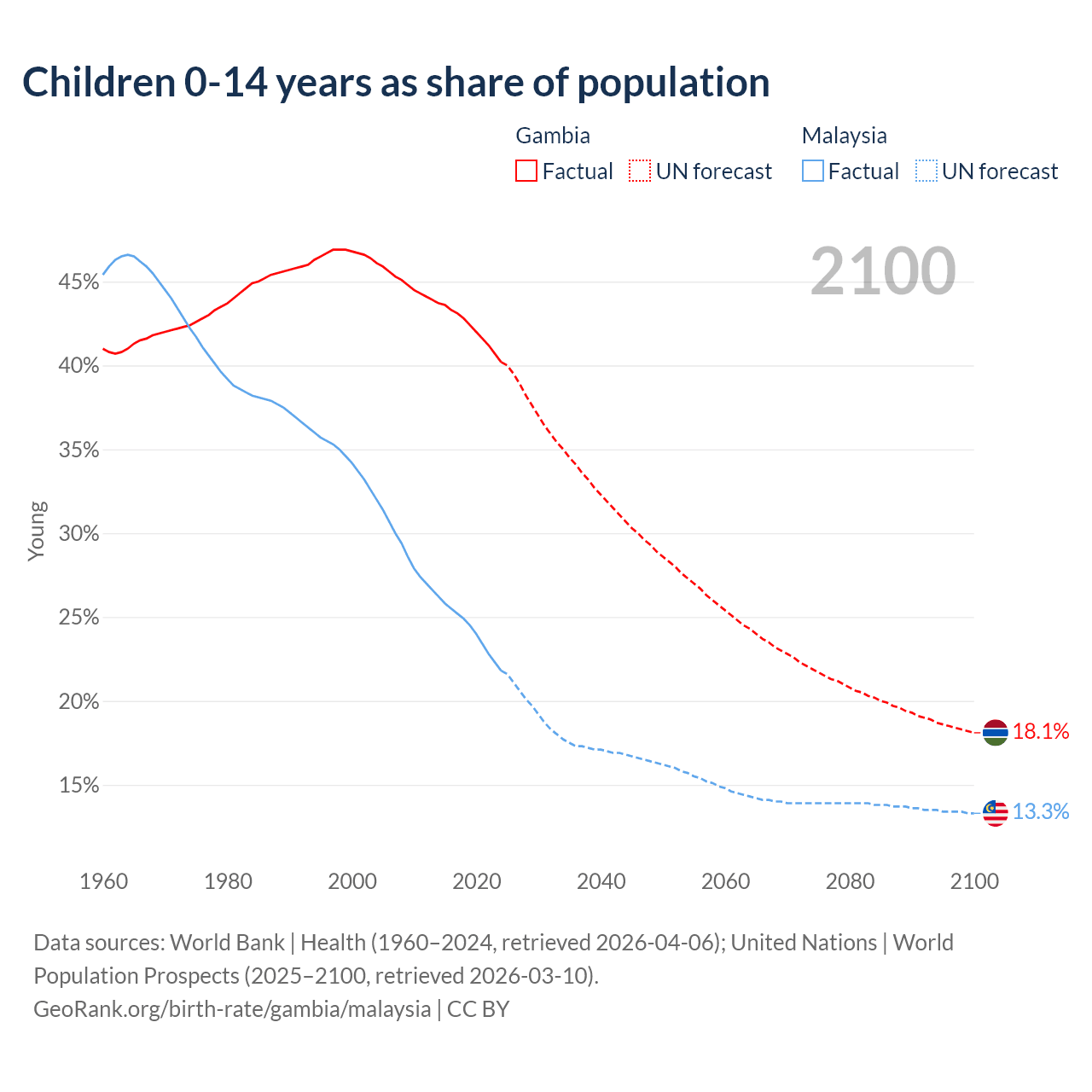 The Gambia has an annual birth rate of 30.4 births per 1,000 people, compared to 12.4 for Malaysia. The average number of children a woman is expected to have during her lifetime — the fertility rate, is 4.01 in the Gambia and 1.55 in Malaysia — 61.3% difference.